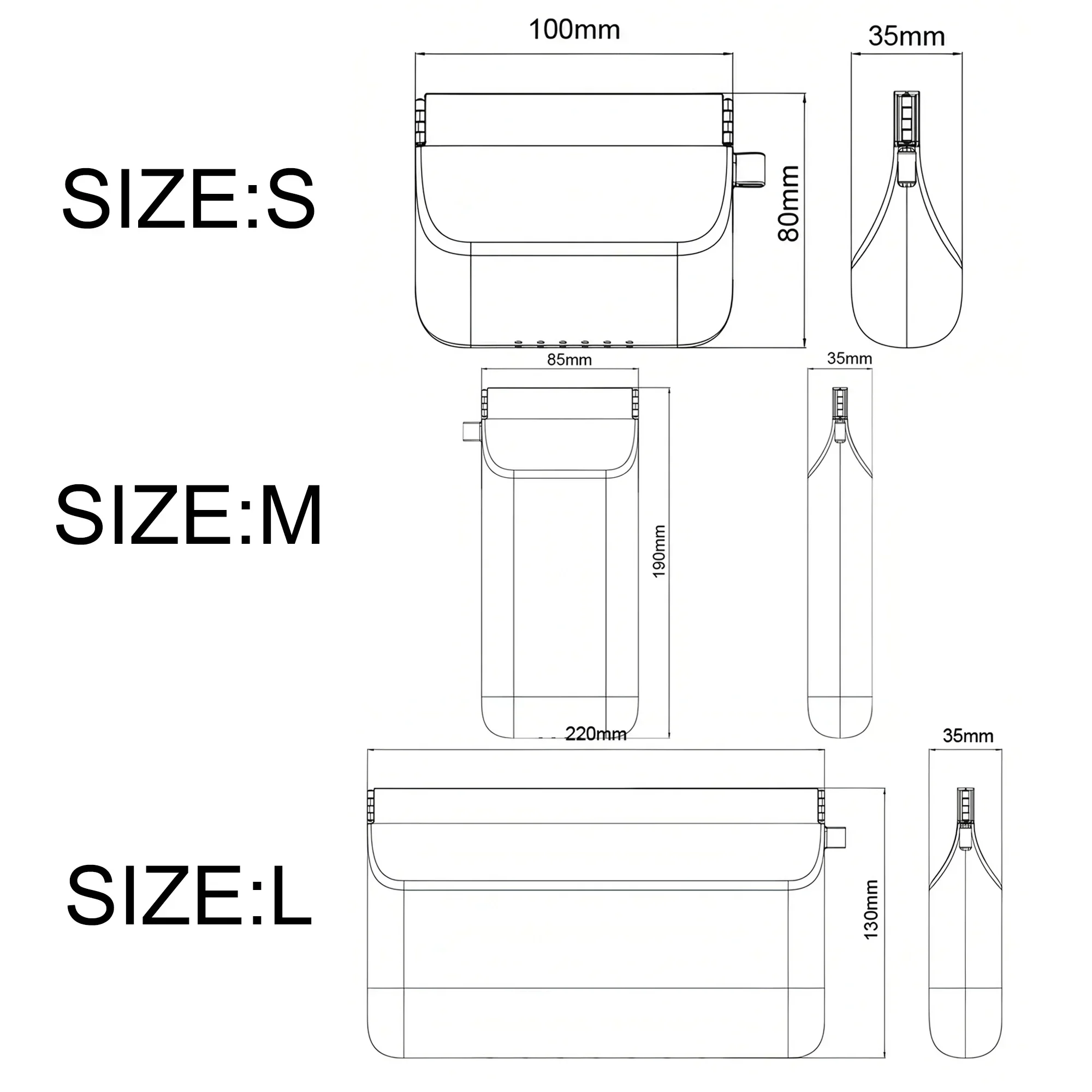 - Three practical sizes—small (100x80x35mm), medium (85x190x35mm), large (220x130x30mm)—cater to different storage needs, from tiny accessories to larger personal items.