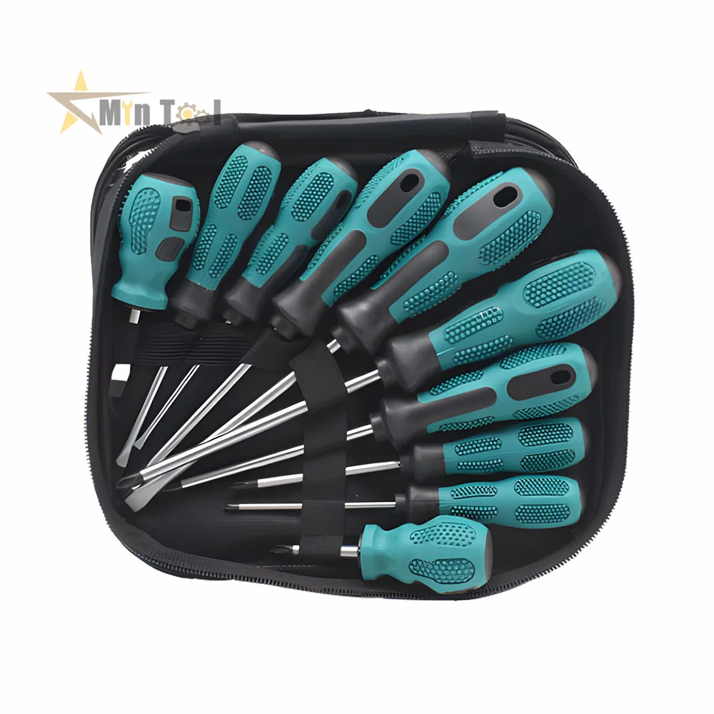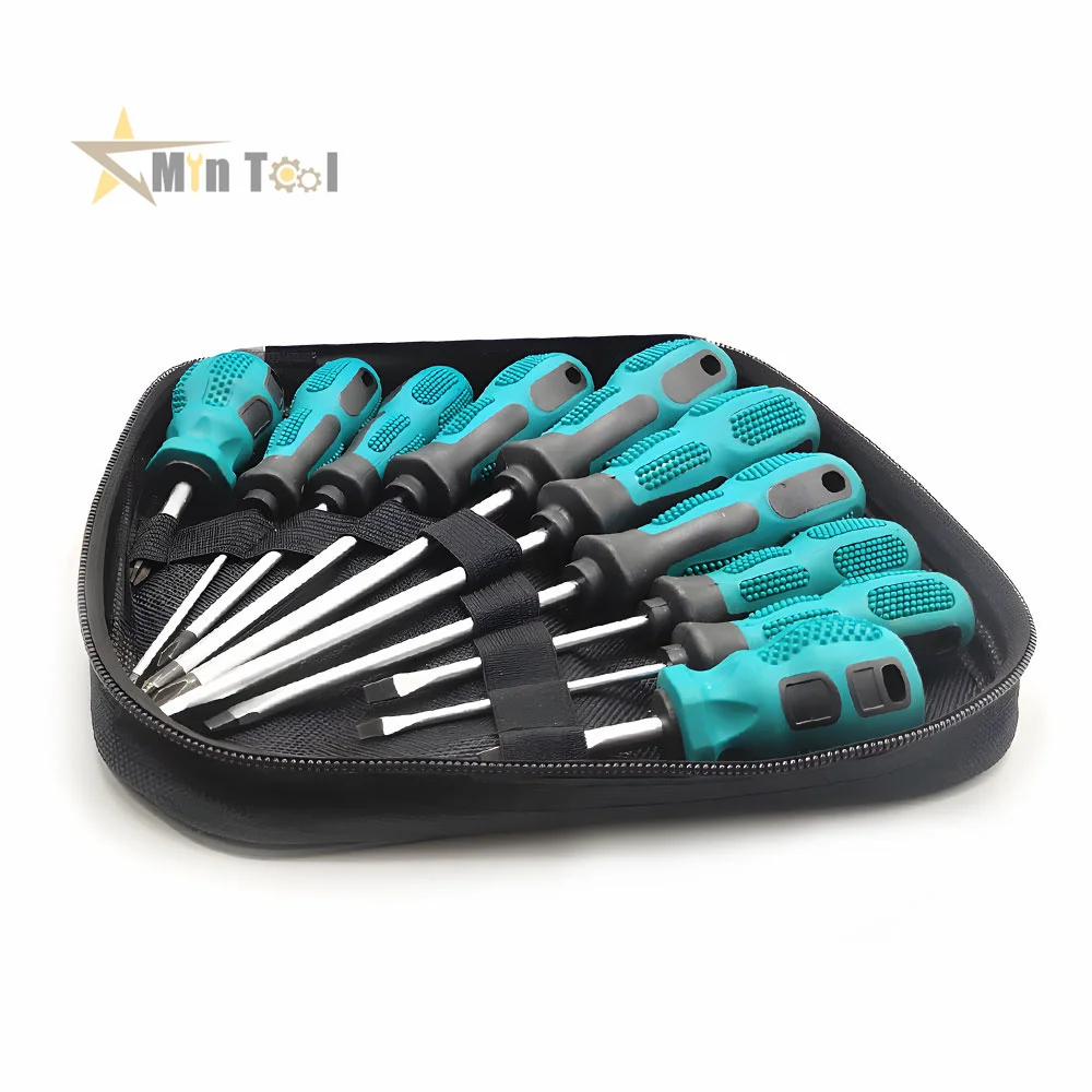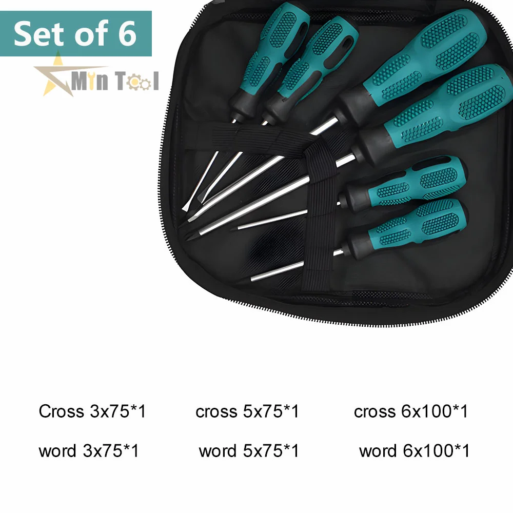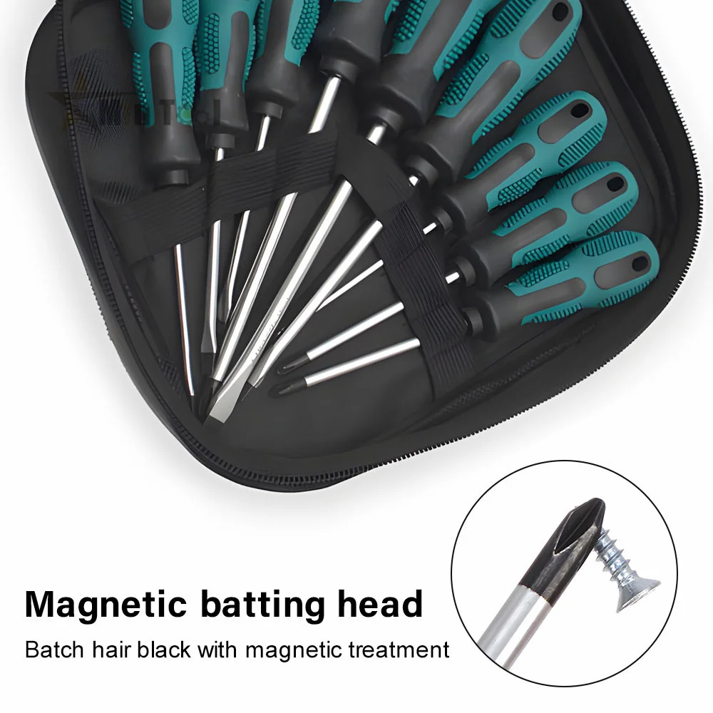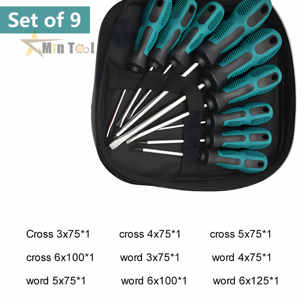 Imagine having the right tools at your fingertips to tackle any repair or maintenance task. This screwdriver set, available in 6 or 9 pieces, features ergonomic teal handles with black accents, ensuring a comfortable grip for prolonged use. Crafted from durable chromium vanadium steel, these screwdrivers are built to withstand heavy Duty. The magnetic heads secure screws in place, making your work more precise and less frustrating. The set includes a variety of tips: Phillips, straight, cross, hex, Pozidriv, Y-type, and Tri-Wing, covering every screw type you might encounter. Compact and organized in a sleek 22×9.5×4 cm case, this set is perfect for car repairs, machinery disassembly, or home maintenance. It’s a practical choice for professionals and DIYers alike.
