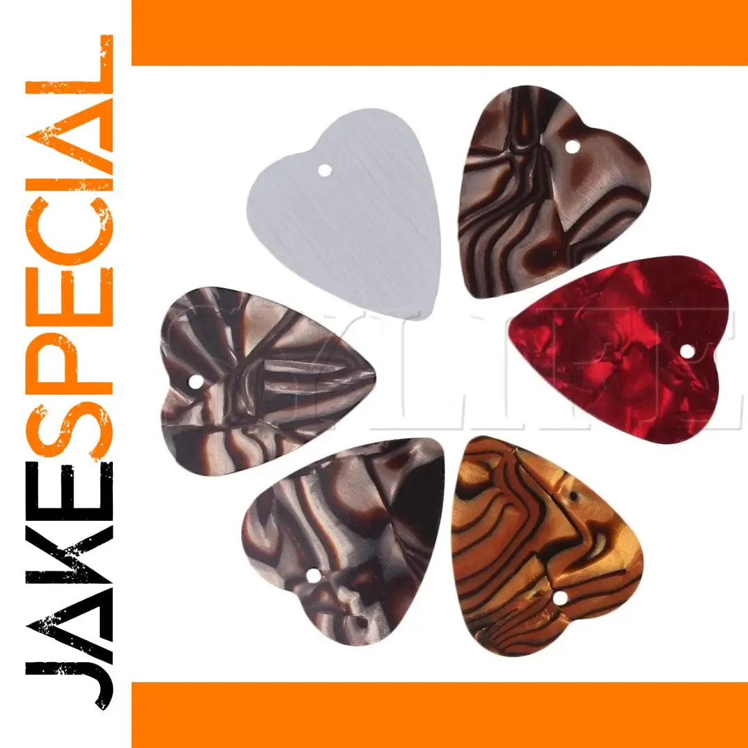 Imagine adding a splash of color and elegance to your musical sessions with this set of six heart-shaped guitar picks. Made from durable celluloid, each pick measures about 3 x 2.5 cm (1.18 x 0.98″) and weighs approximately 6 grams, providing an ideal balance between flexibility and control. Their unique shapes and colorful, marbled, or swirled patterns make them both functional and aesthetically pleasing. The smooth surface and rounded edges ensure comfortable play without any sharp points, whether you're strumming your guitar, bass, or ukulele. Lock yourself into your musical rhythm with a style that expresses your personality and passion. These picks are perfect for musicians who enjoy a touch of individuality with their sound.