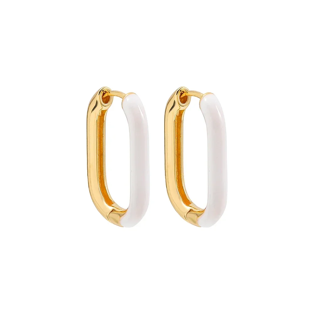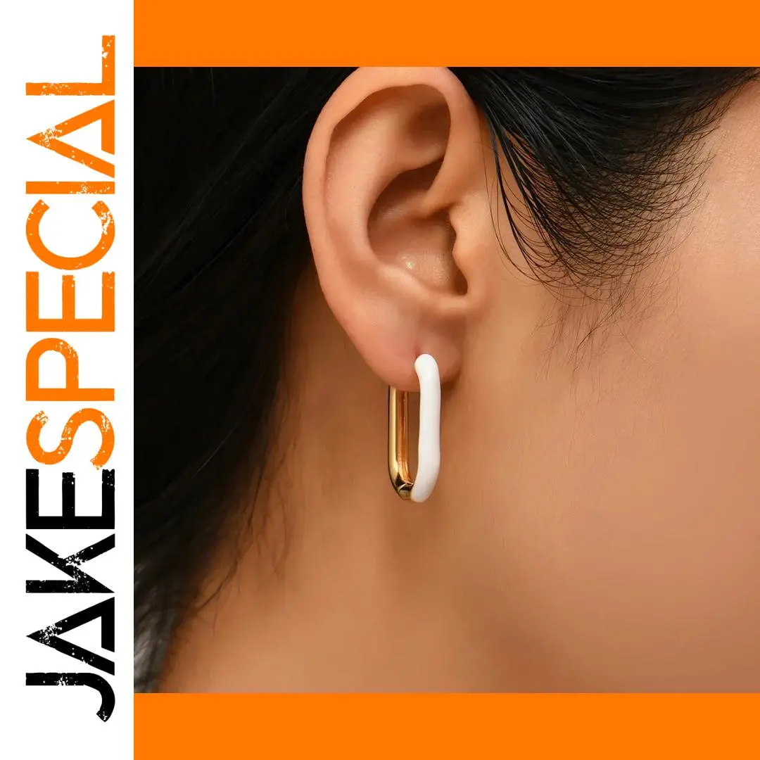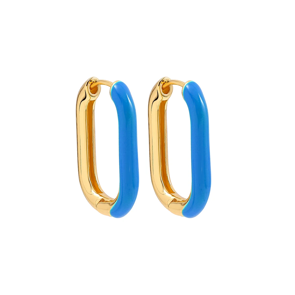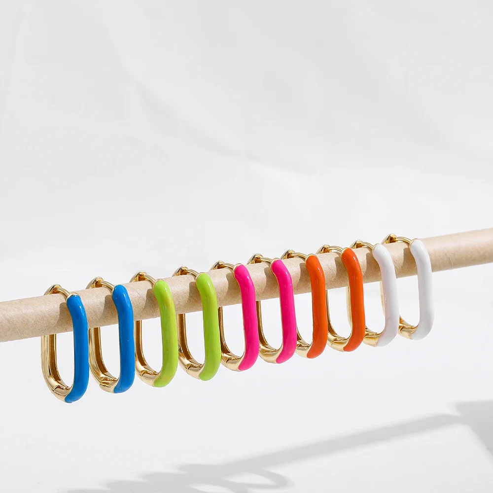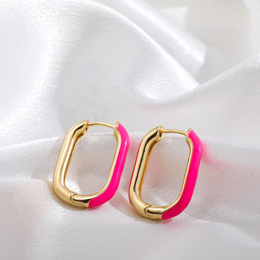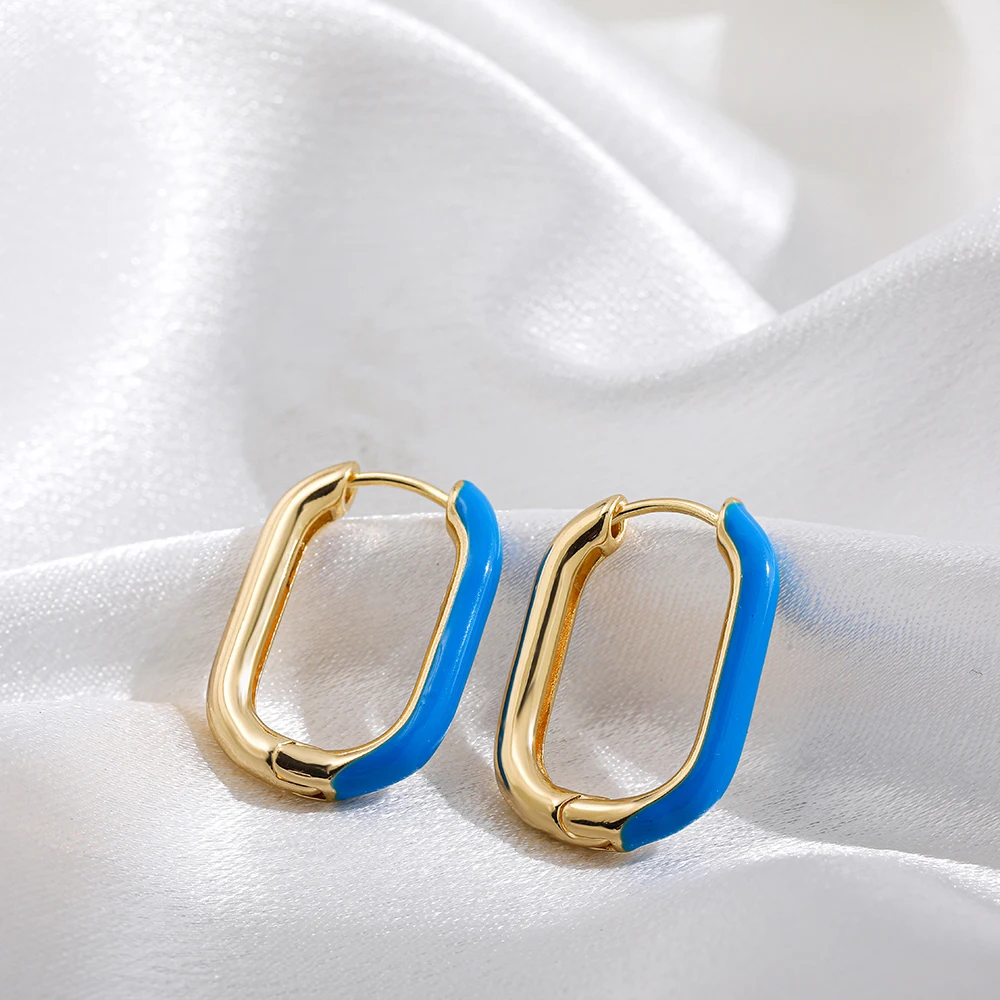 Enhance your everyday look with these beautiful multicolored enamel hoop earrings, designed to add a splash of vibrant color and modern elegance to your wardrobe. Made from durable zinc alloy, these earrings feature a sleek, geometric oval shape with a polished finish. The lower part boasts a radiant metallic gold tone, contrasted by the glossy, smooth enamel coating on the upper section available in lively shades of blue, orange, white, green, and rose red. Their lightweight design ensures comfort, making them perfect for any occasion – from casual outings to special celebrations. These earrings are versatile fashion accessories that complement various styles, adding a touch of sophistication and fun. Embrace your individuality with these eye-catching earrings that make every outfit pop.