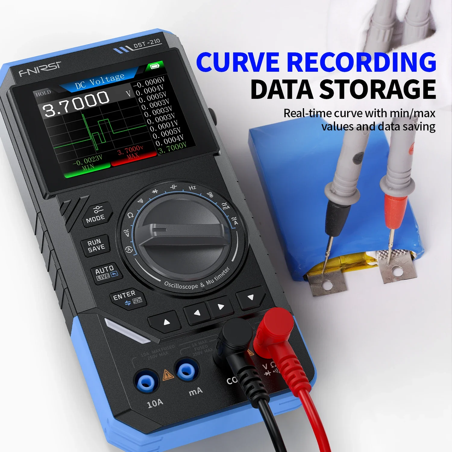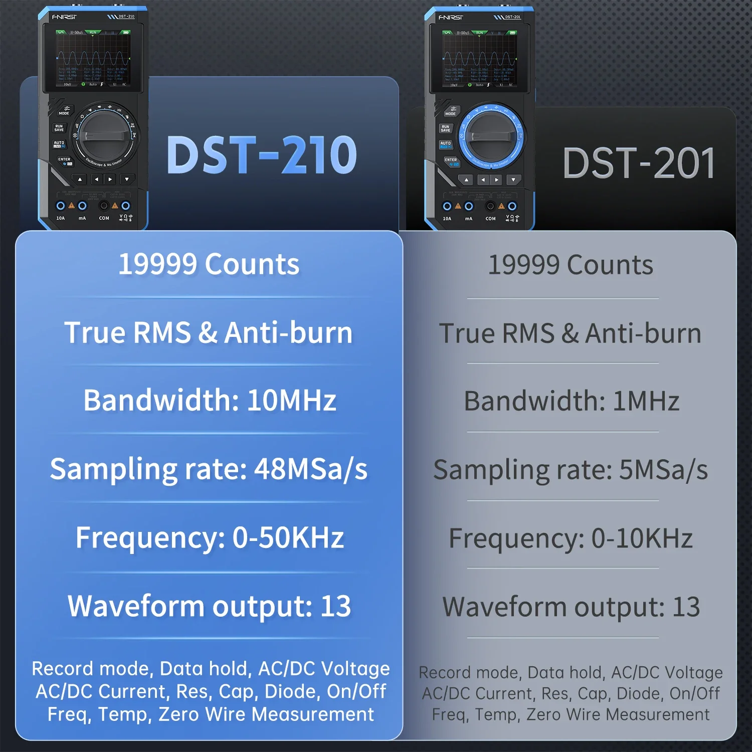 - High-performance oscilloscope with real-time sampling rates of 5MSa/s (DST-201) and 48MSa/s (DST-210), plus bandwidth options of 1MHz and 10MHz for detailed waveform analysis.
