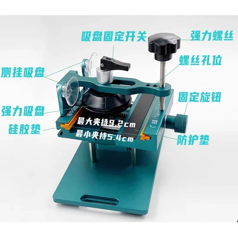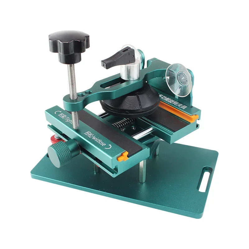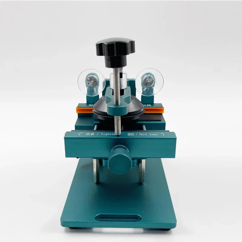 Experience the convenience of this multifunctional phone repair frame, designed to simplify your screen removal and back cover glass disassembly tasks. Its sturdy rectangular metal frame provides exceptional stability, ensuring accurate and safe operations. The large, black, rotating fixture at the top allows 360° rotation, securely holding your phone’s back cover or screen for precise handling. Adjustable components, including a black clamp with a silver hinge, enable customized grip and firm positioning, while the orange sliding mechanism offers fine-tuned pressure control. A knurled silver knob allows precise adjustments, and the blue lever at the bottom helps apply downward force effortlessly. Crafted from durable materials, this device blends industrial design with practicality, making your repair process faster and more professional.