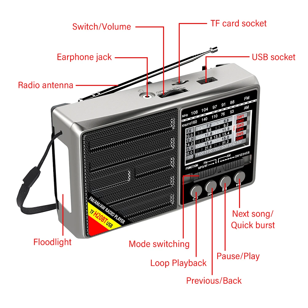 Enhance your listening experience with this reliable, feature-rich portable radio. Whether you're camping, traveling, or preparing for emergencies, this device ensures you stay connected to the world. Its sturdy build, diverse functionalities, and attractive design make it an excellent investment. Imagine tuning into your favorite stations seamlessly and enjoying crisp sound quality, all in a compact, stylish package. Don't miss out—take this opportunity to add a dependable, multi-band radio to your collection. Experience the convenience and versatility that makes this radio an essential tool for everyday use and outdoor activities.