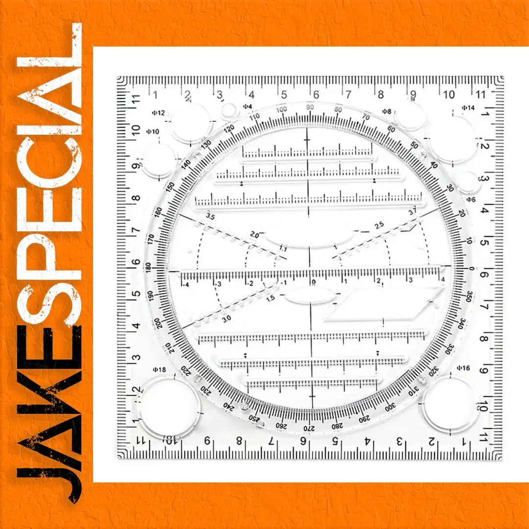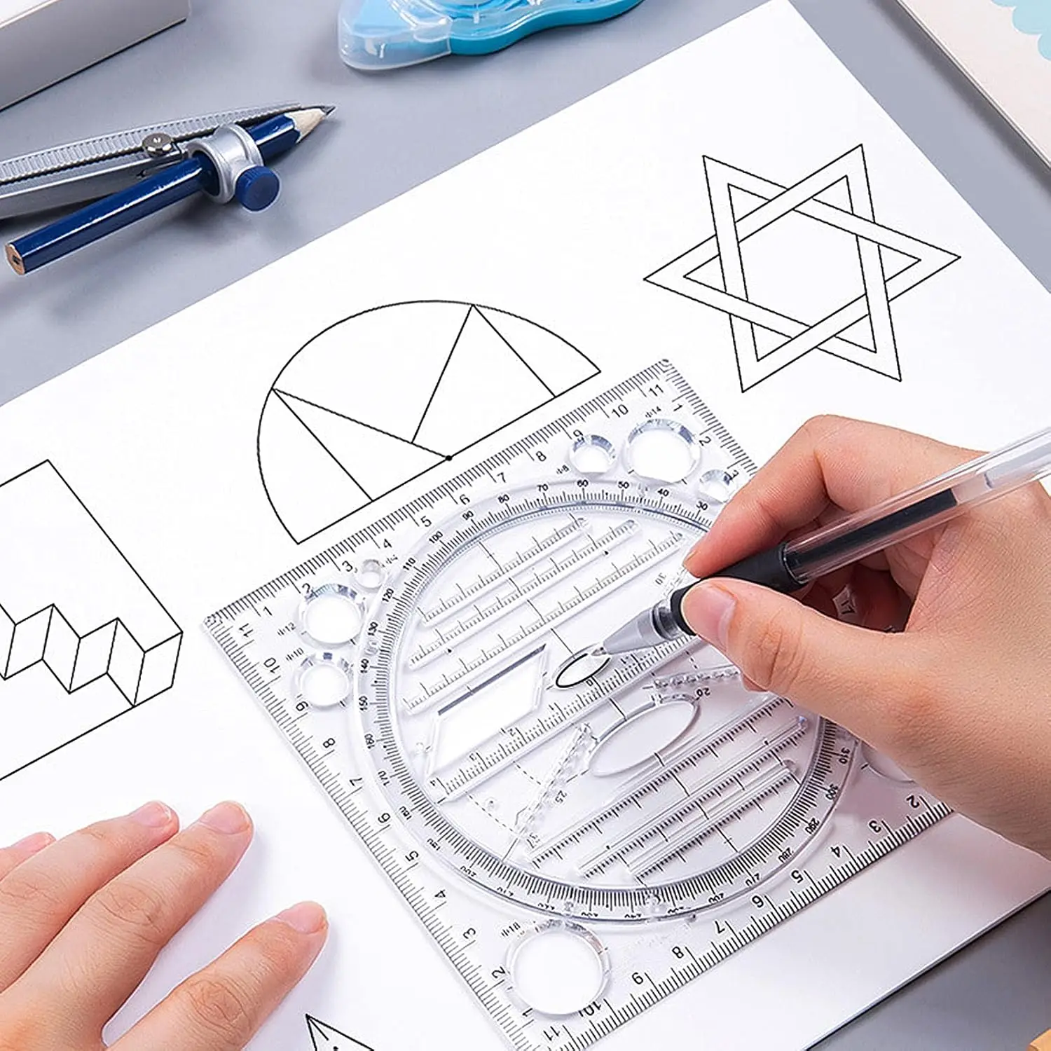 The multifunctional geometric ruler is expertly crafted from high-quality plastic, featuring a transparent design that enhances visibility of important markings. This versatile tool is perfect for artists, students, and designers, allowing for stable drawing of various shapes with clear scales for precise measurements. It includes protractor scales, circle holes with radius marks, polygonal holes, and built-in triangle rulers, making it an essential companion for any creative endeavor. Lightweight and durable, this ruler is easy to carry and available in blue and black colors, ensuring you can tackle any project with confidence and ease.