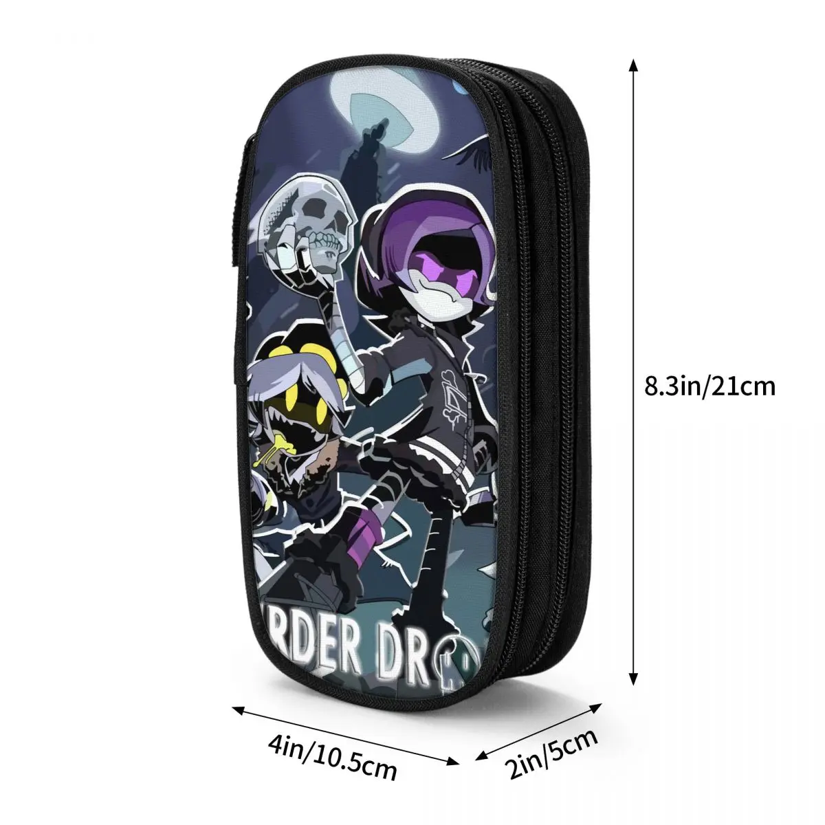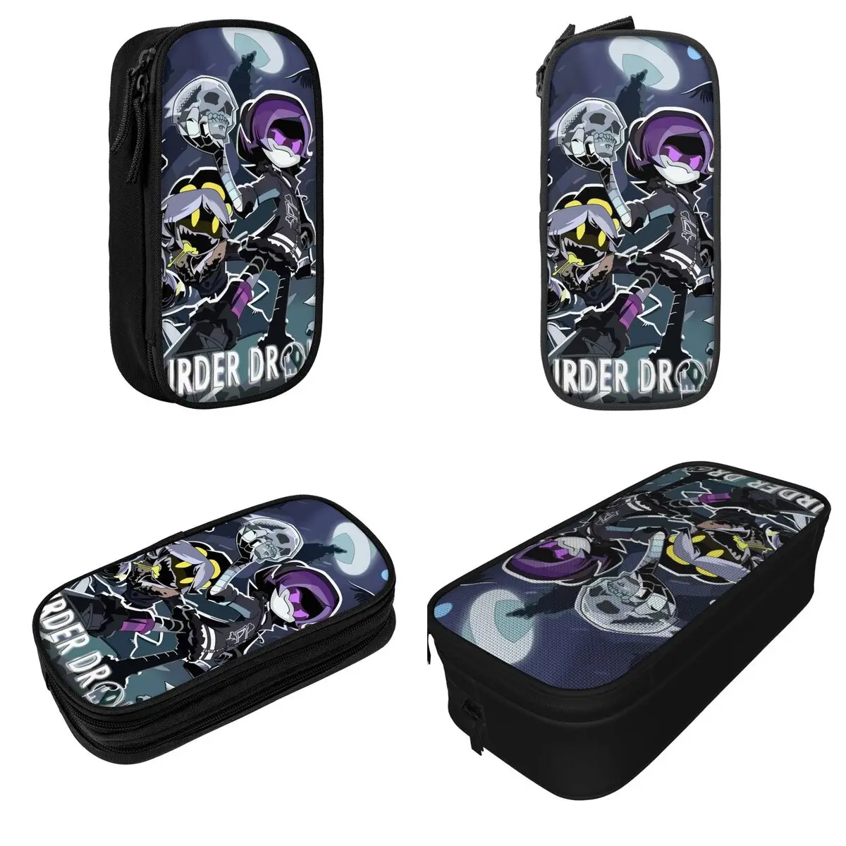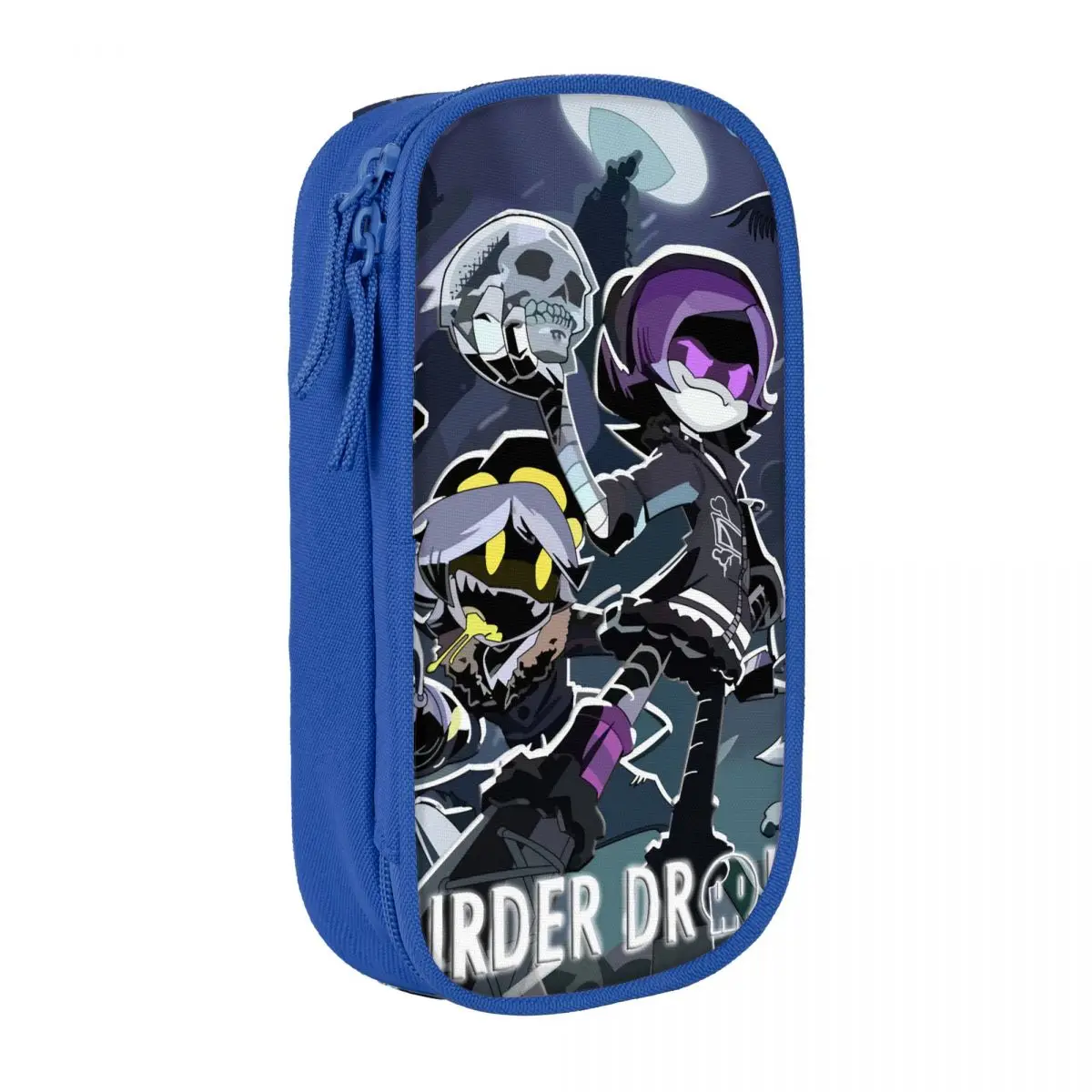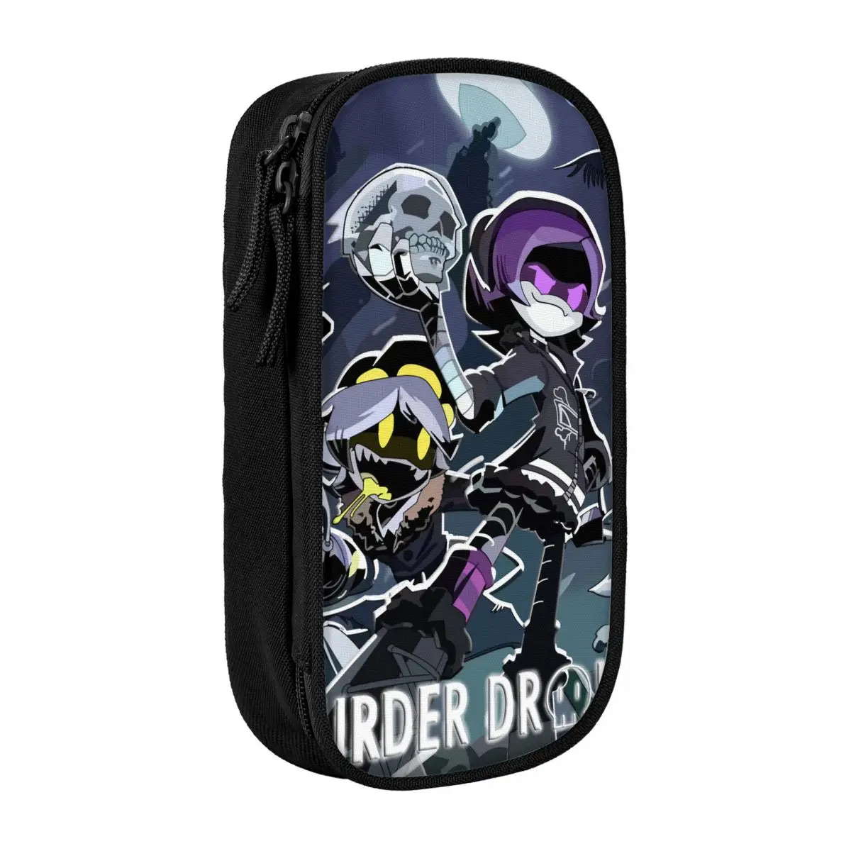 The Murder Drones Anime Pencil Case is your new must-have accessory for organization and flair. Crafted from robust black plastic, it promises durability for everyday use in schools and offices. The engaging design features vibrant animated characters that make it a standout piece. One character, sporting an eye-catching purple hairstyle, holds a skull, while another displays a mischievous grin in yellow and black. The whimsical night scene alongside these characters, with a full moon and ghostly figures, adds to its playful yet edgy aesthetic, making it perfect for personal expression in a school environment or as a thoughtful gift.