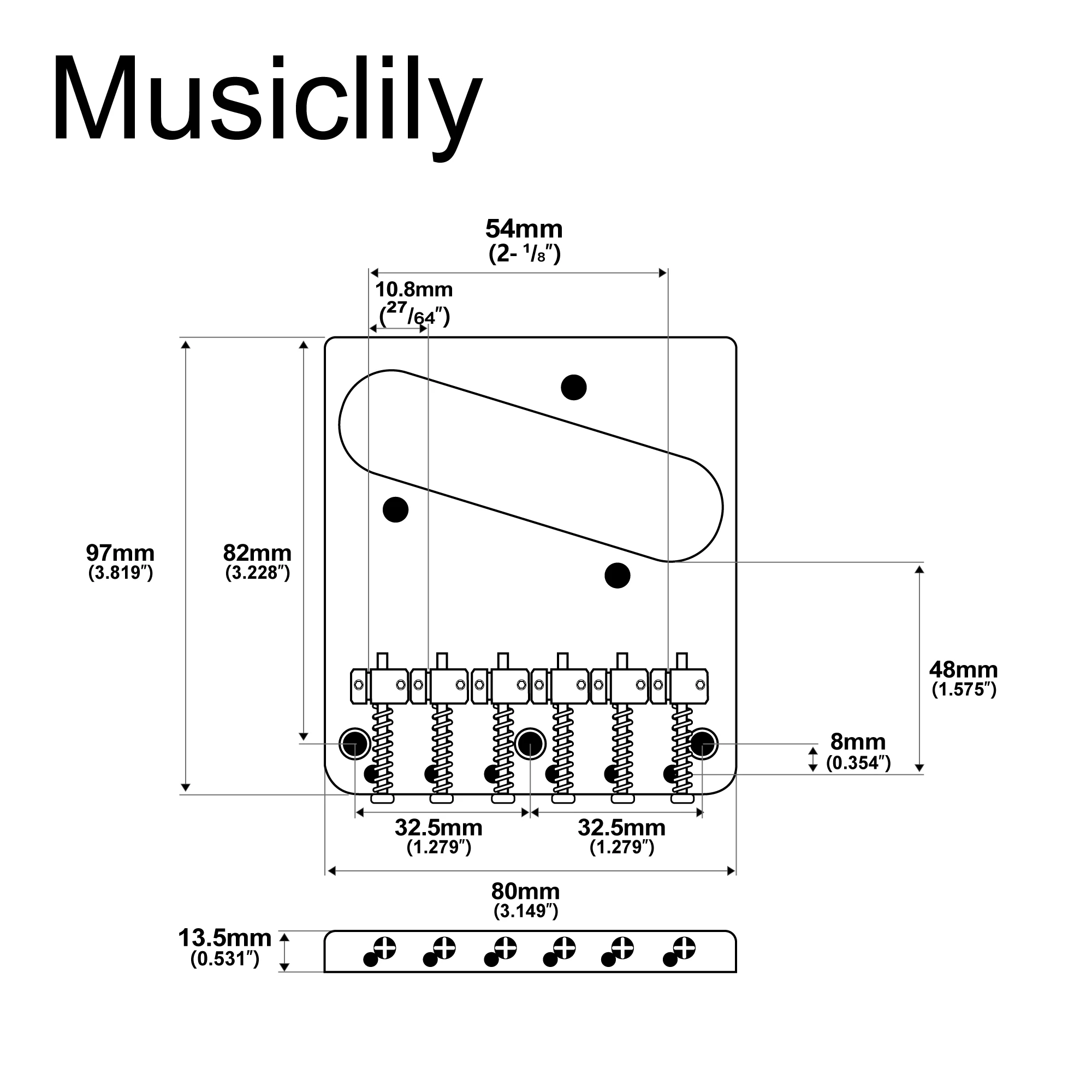 String Spacing: 10.8×5=54mm(2-1/8 inch), 3 mounting screw holes spacing: 65mm(2-9/16 inch)