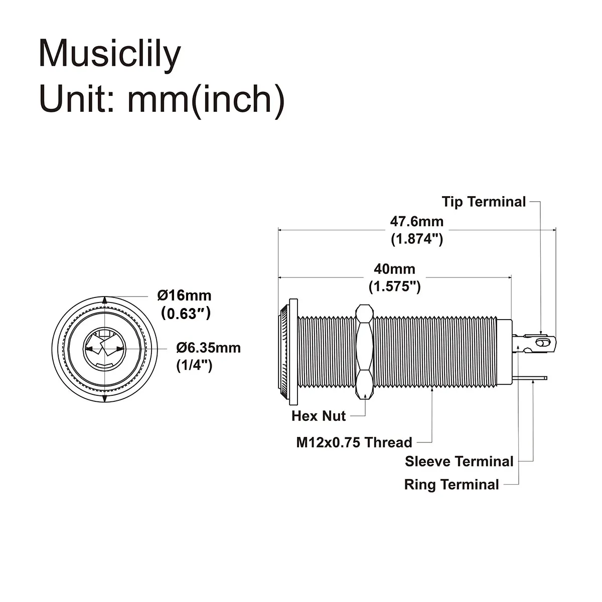 Experience reliable connectivity with this stylish and durable Musiclily Pro 1/4 Inch Metal Mono Guitar/Bass Output Jack. Its sleek cylindrical design with a matte black or chrome finish seamlessly combines modern aesthetics with functional robustness. The grooved surface ensures a secure grip during installation, while the metallic ring around the front opening adds a touch of elegance. Crafted from high-quality copper alloy, this jack guarantees excellent sensitivity, high output efficiency, and noise reduction, making it perfect for electric guitar or bass setups. Measuring approximately 47.6mm in overall length, with a 6.35mm hole diameter and 12mm thread diameter, it’s designed for easy installation across various instruments. Whether upgrading or repairing, this jack promises long-lasting performance and dependable connection every time you play.