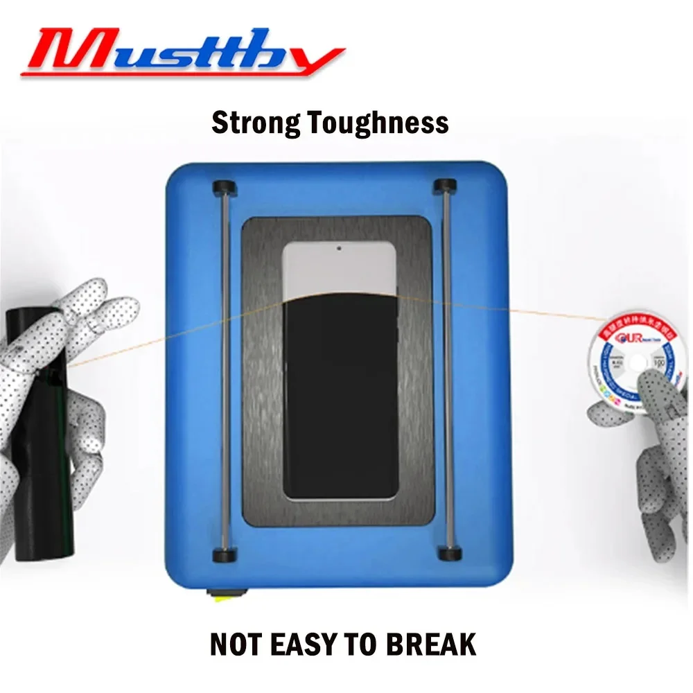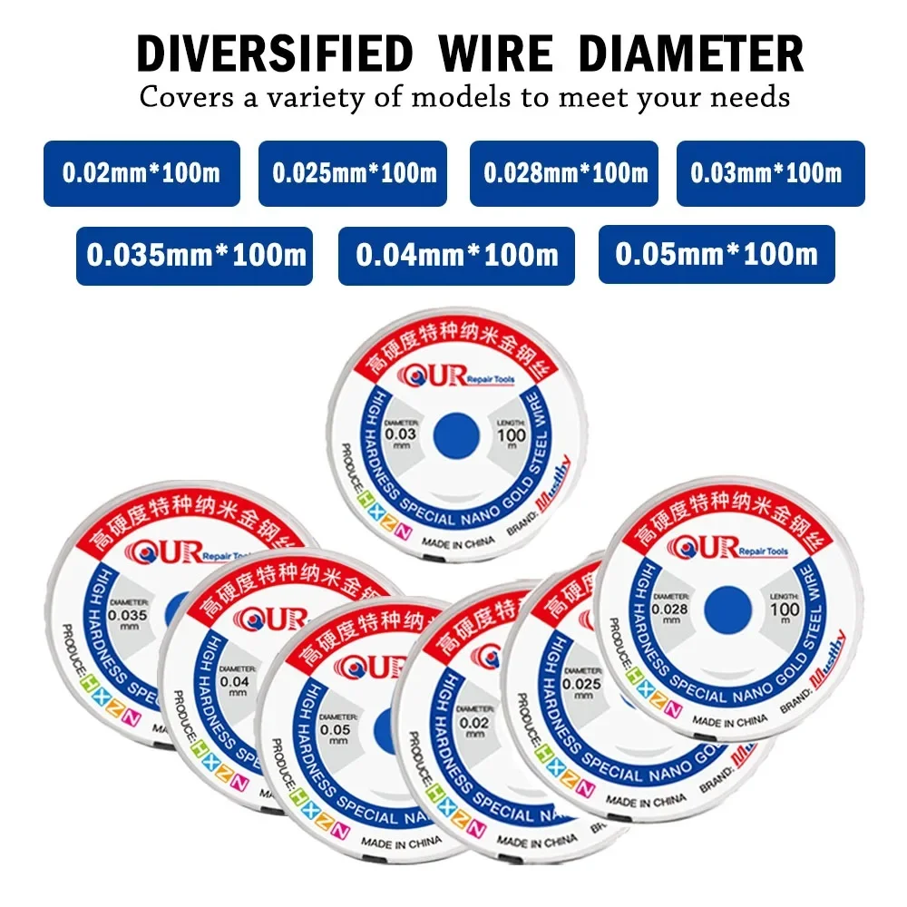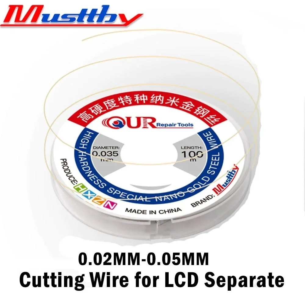 Introducing the Musttby Gold Wire, your essential tool for precision phone LCD screen cutting and repair. This high-quality wire comes in multiple thicknesses—0.02mm, 0.025mm, 0.028mm, 0.035mm, 0.04mm, and 0.05mm—ensuring you have the perfect size for any job. Each spool offers a generous length of 100 meters, crafted from durable alloy steel and molybdenum for optimal performance in LCD display screen separation. Experience the reliability and efficiency of Musttby Gold Wire, designed to make your repair tasks seamless and effective, while its clear labeling allows for effortless thickness identification.