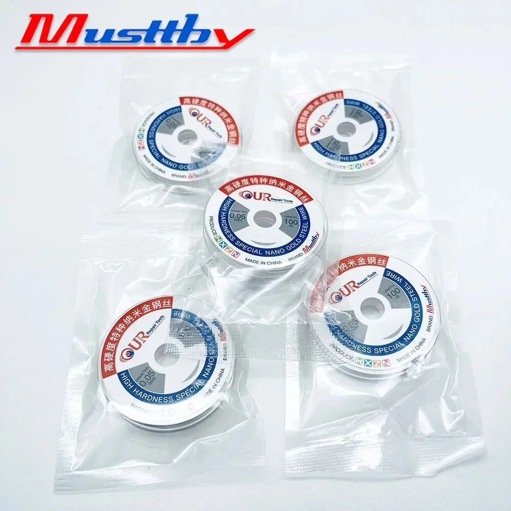 The Musttby gold wire cutting kit includes 10 spools, each measuring 100 meters in length, featuring various thicknesses: 0.02mm, 0.025mm, 0.028mm, 0.035mm, 0.04mm, and 0.05mm. Crafted from high-hardness alloy steel molybdenum, this cutting wire is specifically designed for precision in LCD screen cutting and repair tasks. The spools showcase a shiny metallic finish, providing both durability and a professional aesthetic that enhances any workspace. Perfect for enthusiasts and professionals alike, this set ensures you have the right tools to tackle your repair projects efficiently and effectively.