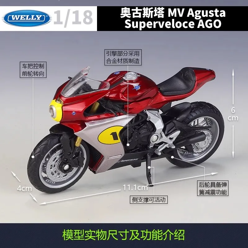 Experience the dynamic design of this 1:18 scale diecast motorcycle model inspired by the MV Agusta Superveloce AGO. Measuring 4 cm high, 11.1 cm long, and 6 cm wide, it features a vibrant red glossy alloy fuel tank, aerodynamic fairings, rubber tires, and detailed black plastic components. The model includes a functional shock absorber, with front gold-colored suspension accents and a yellow circular decal with a black “1,” emphasizing its racing heritage. Crafted from high-quality plastic (PC), this collectible or gift item is suitable for both enthusiasts and adult collectors, offering a striking representation of high-performance motorcycle aesthetics in a compact, durable design.