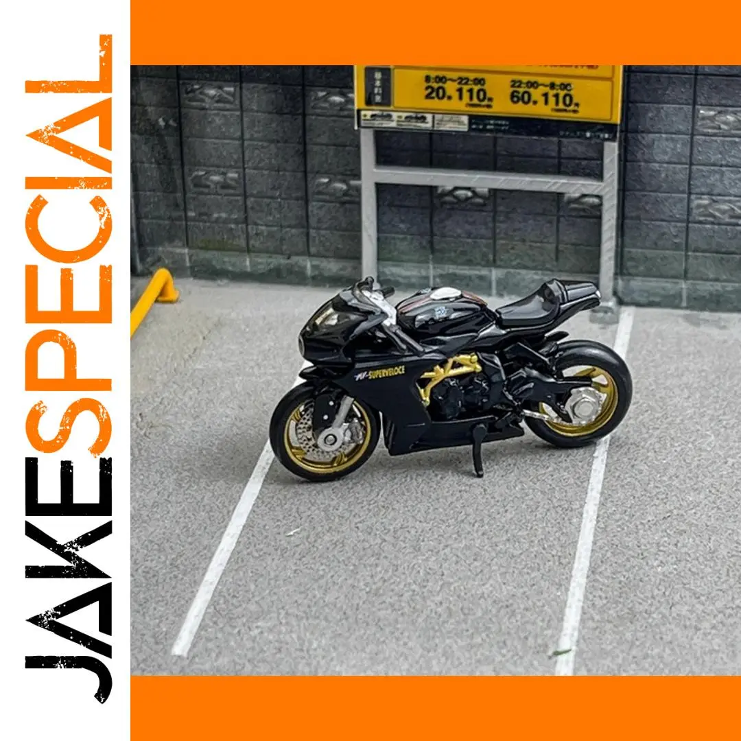 Imagine yourself adding this beautifully crafted diecast model to your collection, showcasing a detailed replica of the MV800 motorcycle. With its sleek, matte black finish and striking metallic gold accents along the frame and wheels, this model exudes modern sophistication. Silver elements on the front fork, brake disc, and engine parts add realism and elegance. Designed with aerodynamic contours and a contoured seat, it captures the essence of a real motorcycle in miniature form. Perfectly scaled at 1:64, this model boasts intricate craftsmanship and high attention to detail. Its timeless aesthetic makes it an eye-catching display piece, ideal for collectors and enthusiasts who appreciate realism and quality craftsmanship.