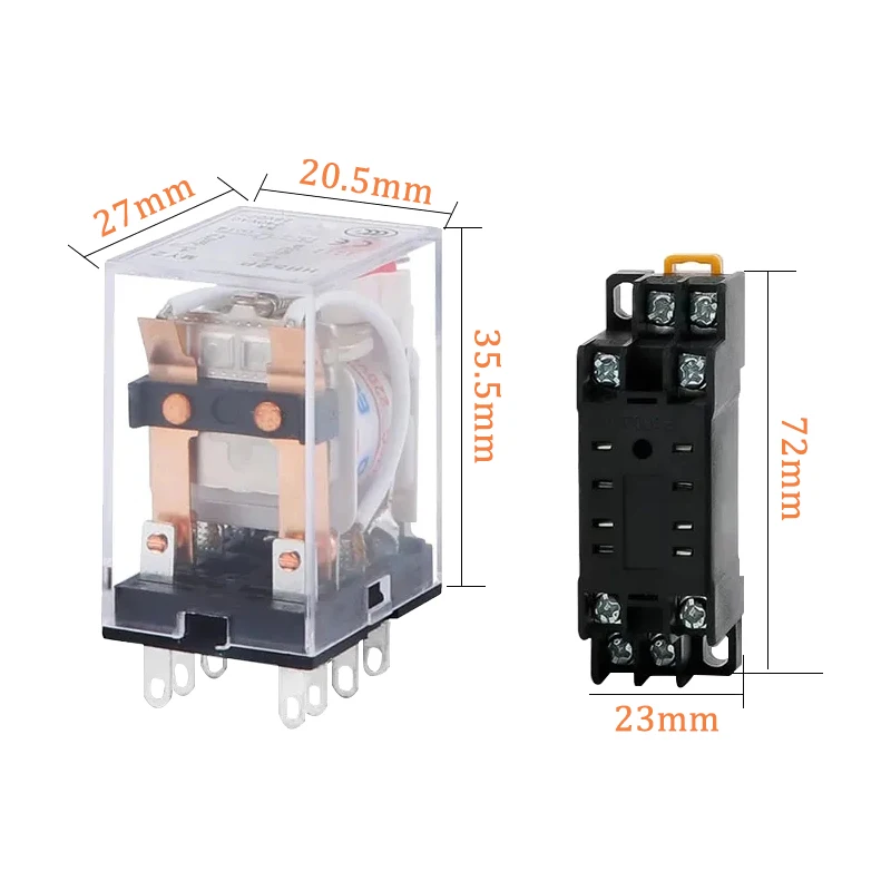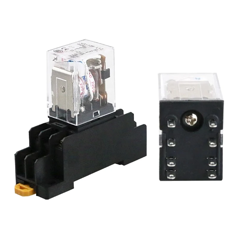 Experience reliable switching with this compact DPDT electromagnetic relay, available in 12V, 24V, 36V, 110V, or 220V coil voltages. Featuring a sleek micro mini design with a matte black plastic housing and a transparent cover revealing internal components, it combines practicality with a modern aesthetic. The relay includes an LED indicator for easy operation status monitoring and offers robust performance for general-purpose switching applications. Its metallic pins are flat and shiny, supporting easy connections to circuit boards or sockets. Perfect for various electronic projects, this versatile relay provides precise control and efficient operation in a compact, organized form factor.
