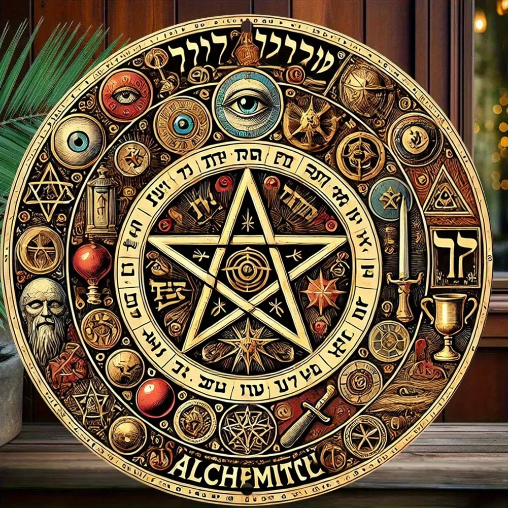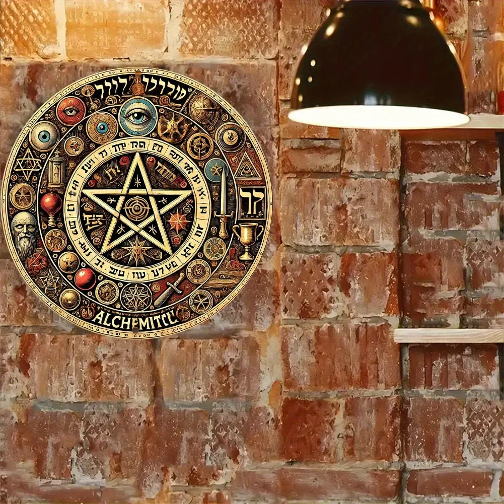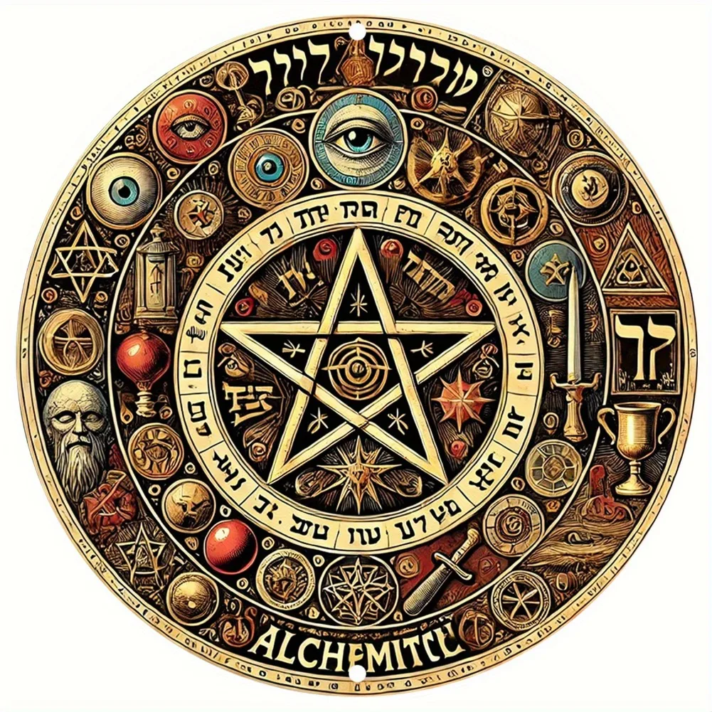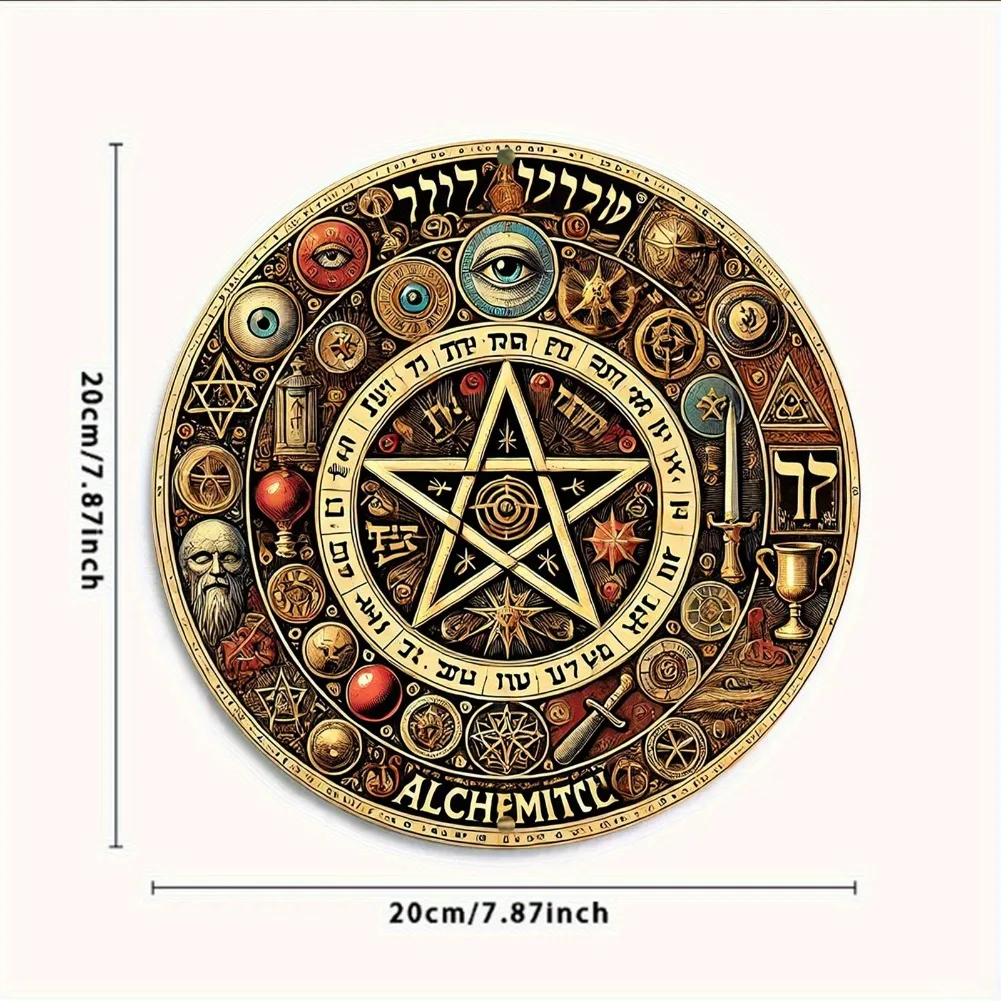 Immerse yourself in the enchanting aura of this this mystical wall hanging, measuring 8×8″. Crafted from durable aluminum, it features an aged, vintage-style design rich in warm shades of gold, brown, red, turquoise, and black. The circular composition showcases a large, central pentagram outlined in a luminous hue, surrounded by concentric rings filled with detailed occult and esoteric symbols. These include Hebrew characters, an eye within a triangle, glowing red orb, scrolls, and alchemical icons, all artistically shaded to give depth and texture. Decorative motifs such as a bearded mystical figure, a star with radiant rays, and a serpent further enhance its mystical allure. Perfect for creating a spiritual, antique ambiance in your space, this piece invites reflection and mysticism.