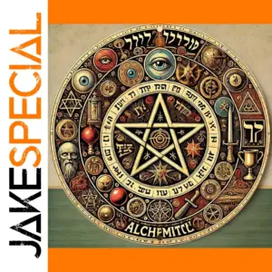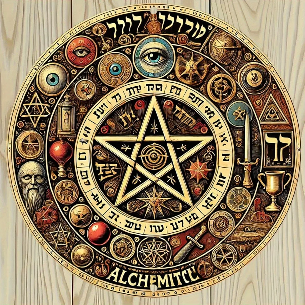 - Design features intricate occult and esoteric symbols, including Hebrew characters, a central pentagram, mystical motifs, and alchemical icons in warm, antique-inspired colors.