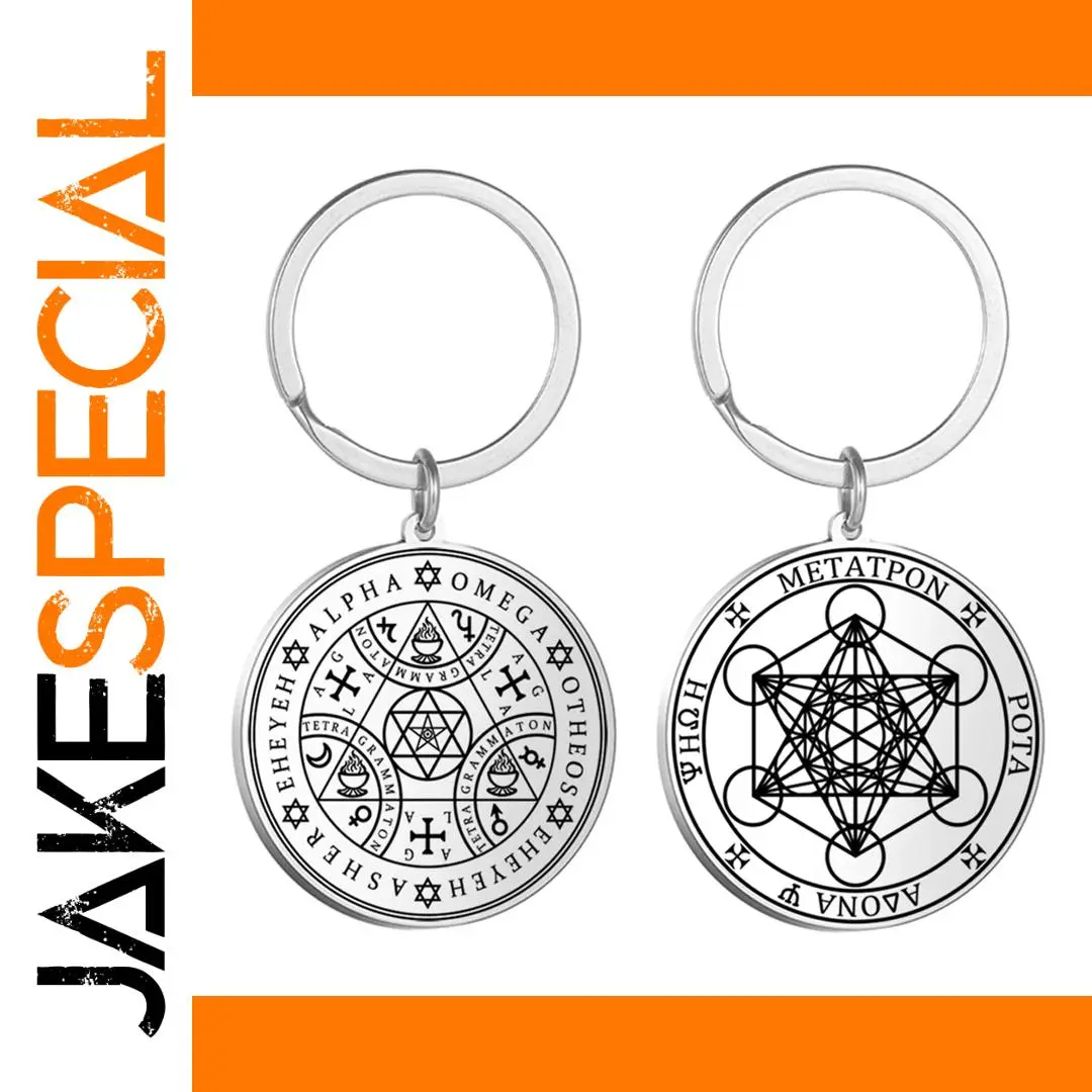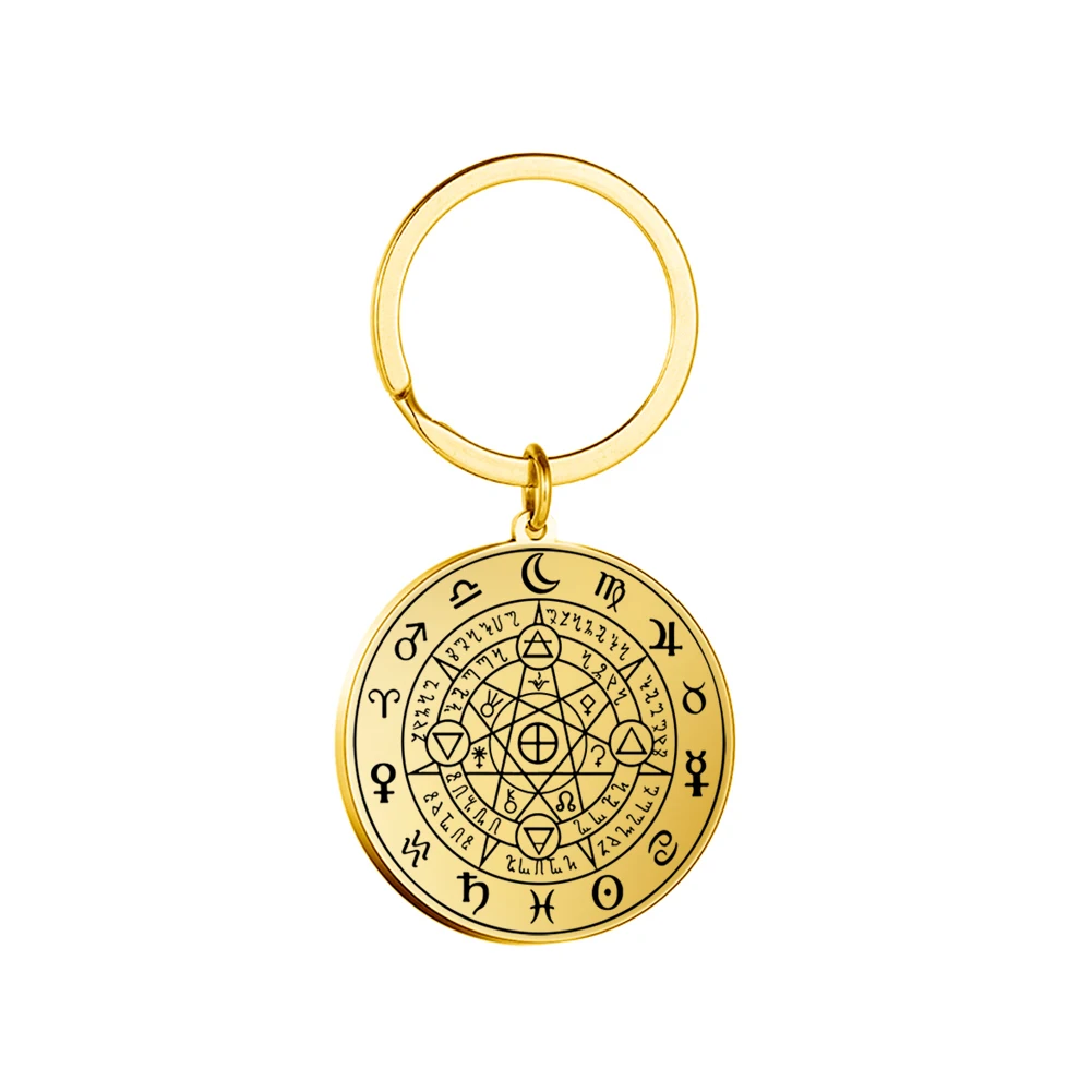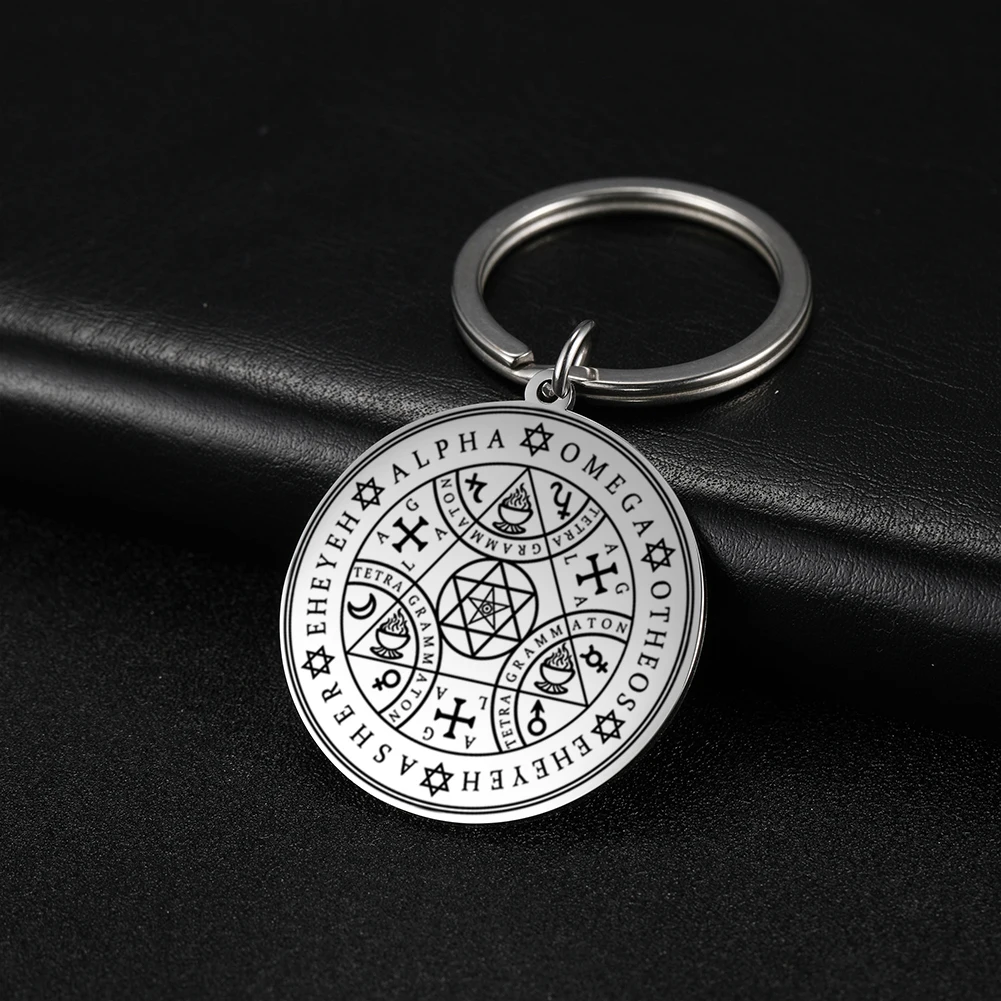 Imagine carrying a piece of spiritual symbolism that resonates deeply with your beliefs and aesthetic taste. This this stainless steel keychain features a sleek, polished round pendant with intricate laser-engraved designs. The vintage-inspired motifs include sacred symbols like the Tetragrammaton, Archangels, and Enochian script, carefully etched on a single face for a refined look. Available in both silver-tone and warm gold-tone finishes, the keychain embodies both elegance and mysticism. Its compact size, around 32×35 mm or 35×38 mm and lightweight design (15 grams), makes it perfect for daily use or as a meaningful gift. Whether for spiritual protection or style, this keychain adds a timeless and personalized touch to your collection.