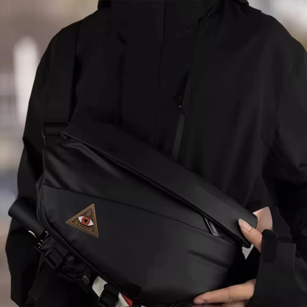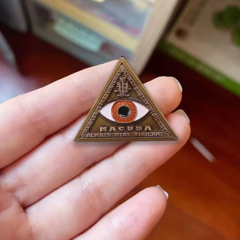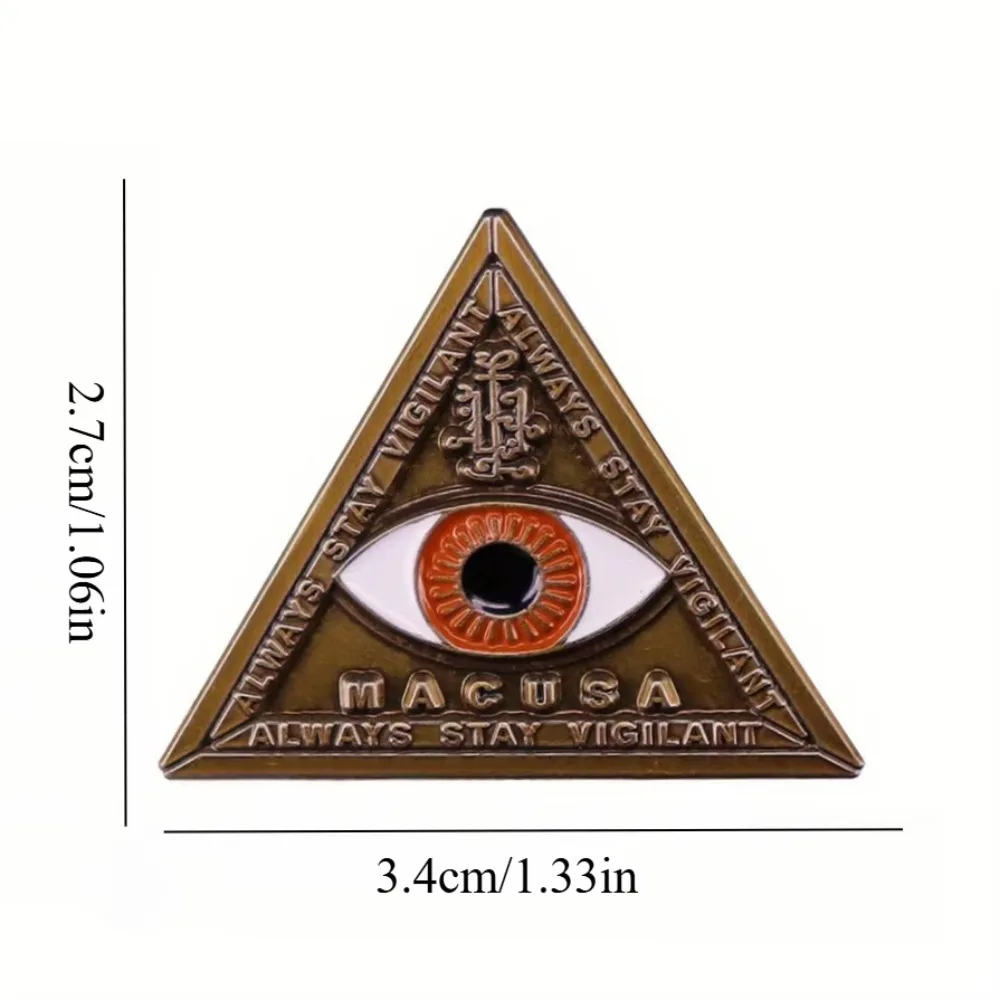 This vintage-style enamel pin badge features a 3.4cm by 2.7cm alloy triangular design with an antique golden finish. The striking central eye, with a white sclera, black pupil, and vibrant orange or red accents, is surrounded by intricate metallic embossed arcane symbols, adding a mystical touch. The smooth, slightly raised border enhances its durability and elegant appearance. Weighing only 8 grams, this retro-inspired accessory is perfect for cosplay, performances, casual wear, or as a distinctive gift. Each pin undergoes quality testing before delivery, offering a unique blend of mysticism and vintage charm to elevate your style.