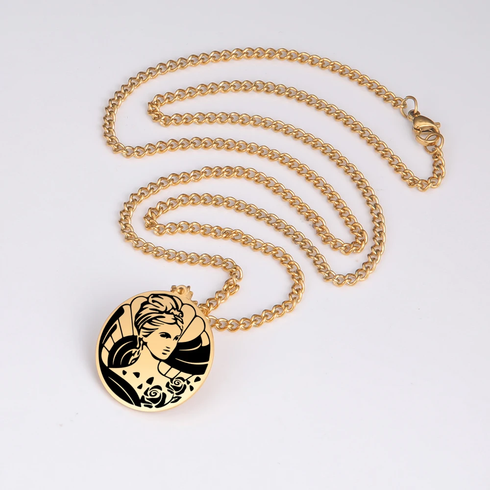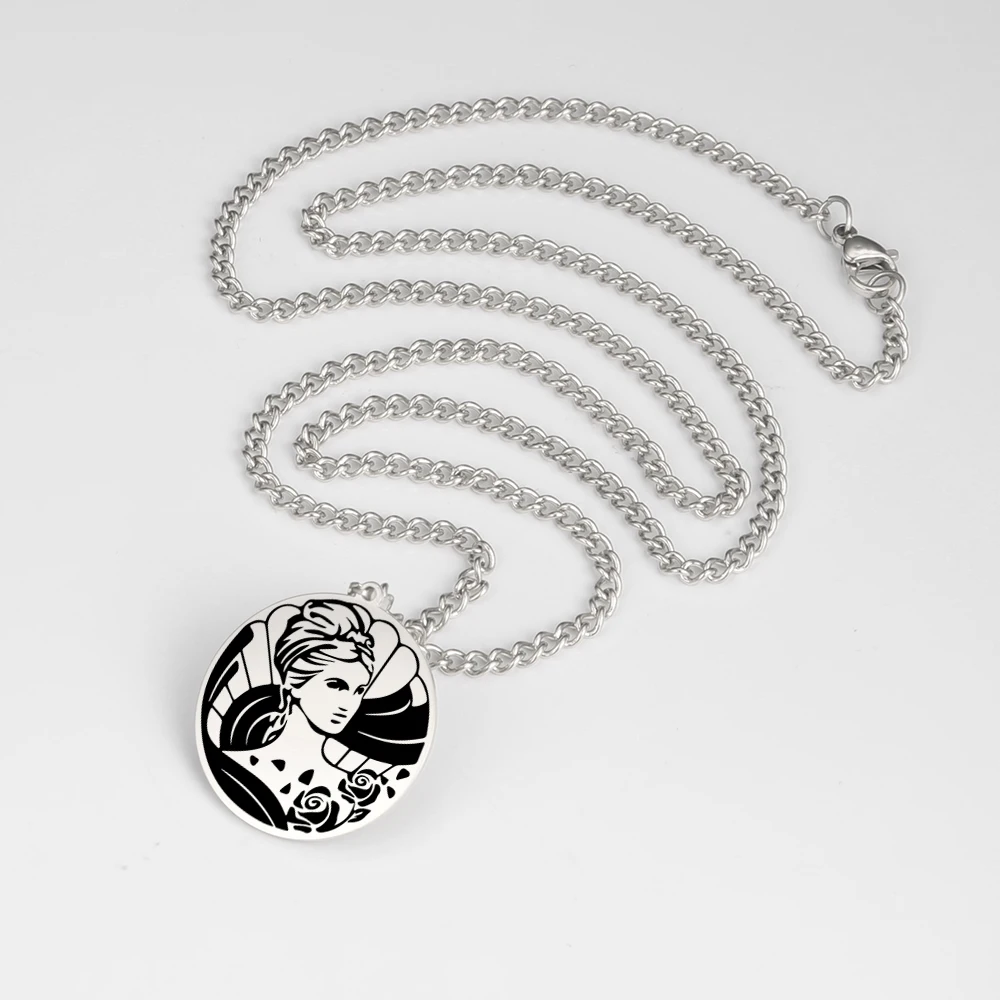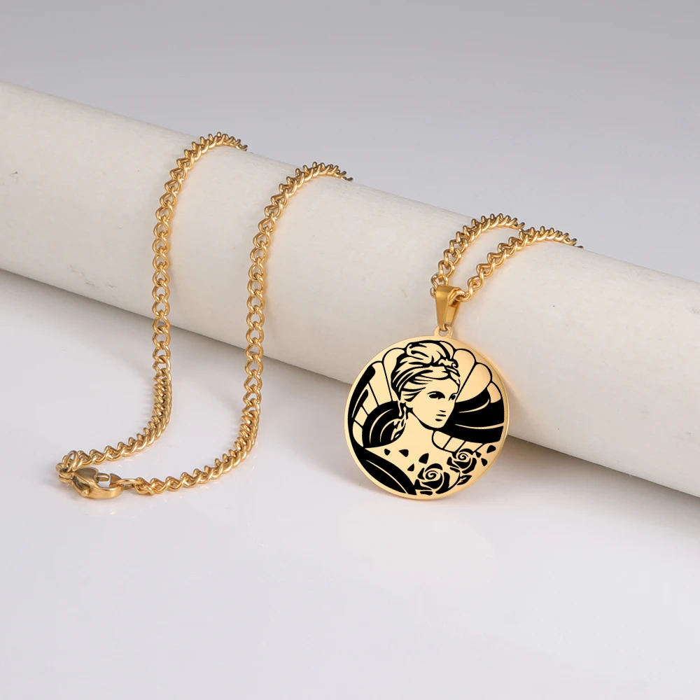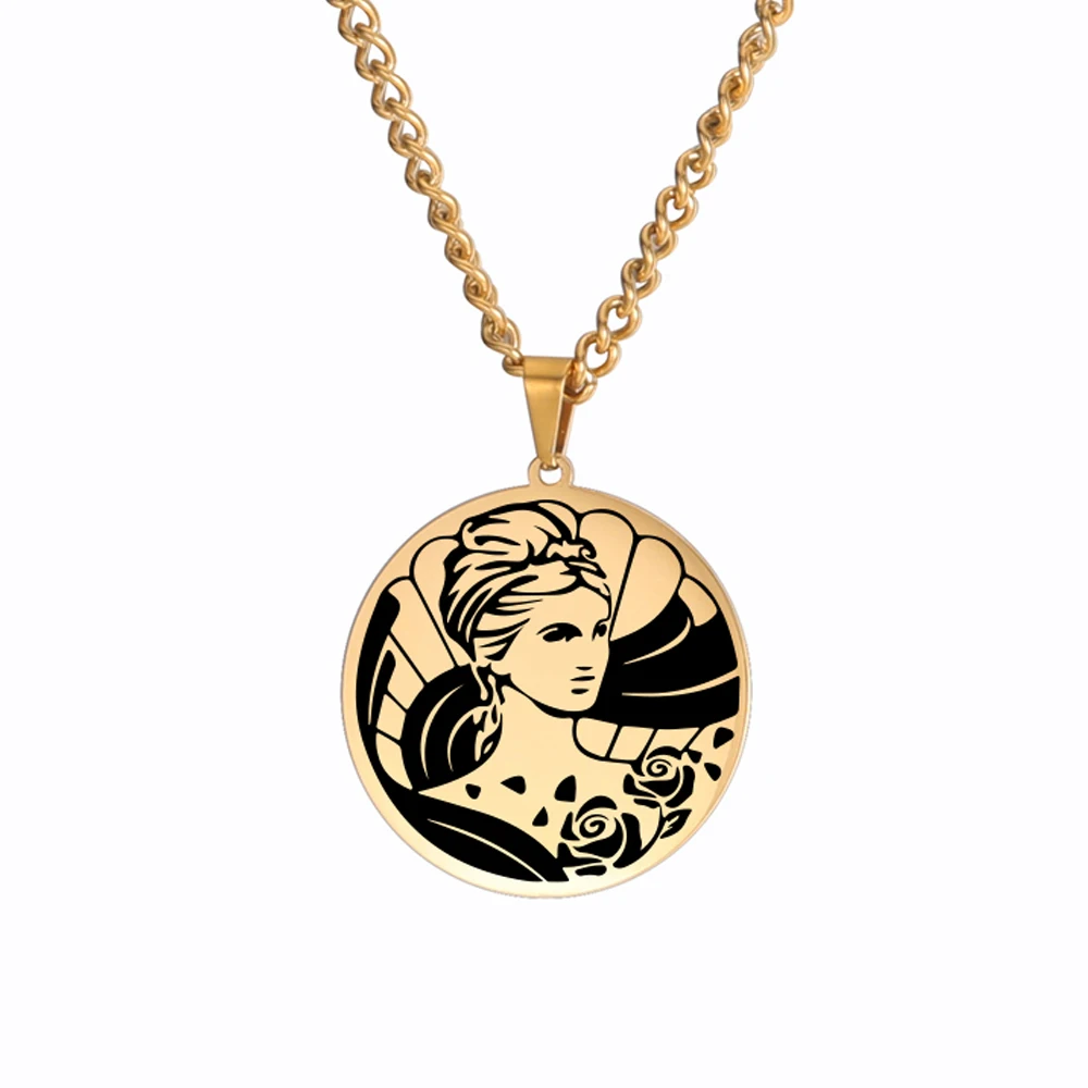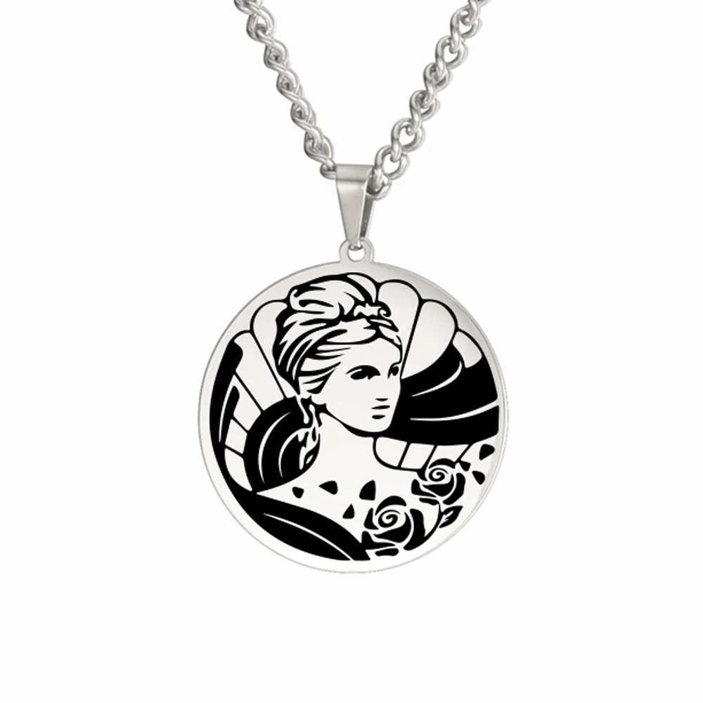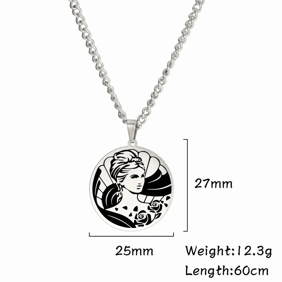 Discover the timeless beauty of this stunning stainless steel pendant necklace inspired by ancient mythology. The round-shaped pendant measures 25 by 27 millimeters, featuring an intricate artistic depiction of a female figure with flowing hair—evoking the goddess Aphrodite or a mythological deity. The polished, reflective surface enhances its elegant appeal, while the contrasting black outline accentuates the detailed design. Crafted in stainless steel, this unisex necklace combines durability with sophisticated style, making it perfect for special occasions like anniversaries. The chunky link chain complements the vintage aesthetic, creating a bold yet refined look that can elevate any outfit with a touch of mythological charm. Whether worn alone or layered, this necklace is a statement piece that offers both beauty and resilience.