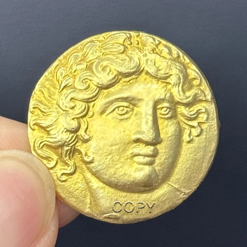 Imagine owning a piece that seamlessly blends artistic mastery with mythology’s enduring allure. This Mythology Copper, measuring exactly 24mm in diameter, showcases a highly detailed, high-relief carving of a mythological face, most likely Apollo, with flowing, curly hair that exudes ancient artistry. The piece features two stunning finishes: a shiny, reflective gold tone that highlights intricate relief work and offers a luxurious glow, and a matte silver finish that presents a refined, vintage aesthetic, emphasizing texture and depth. Crafted from premium copper without chemical additives, it guarantees durability, purity, and timeless beauty. Its textured background and polished surface captivate, making it an exceptional display piece, perfect for collectors, enthusiasts, or as a meaningful gift celebrating mythological heritage.