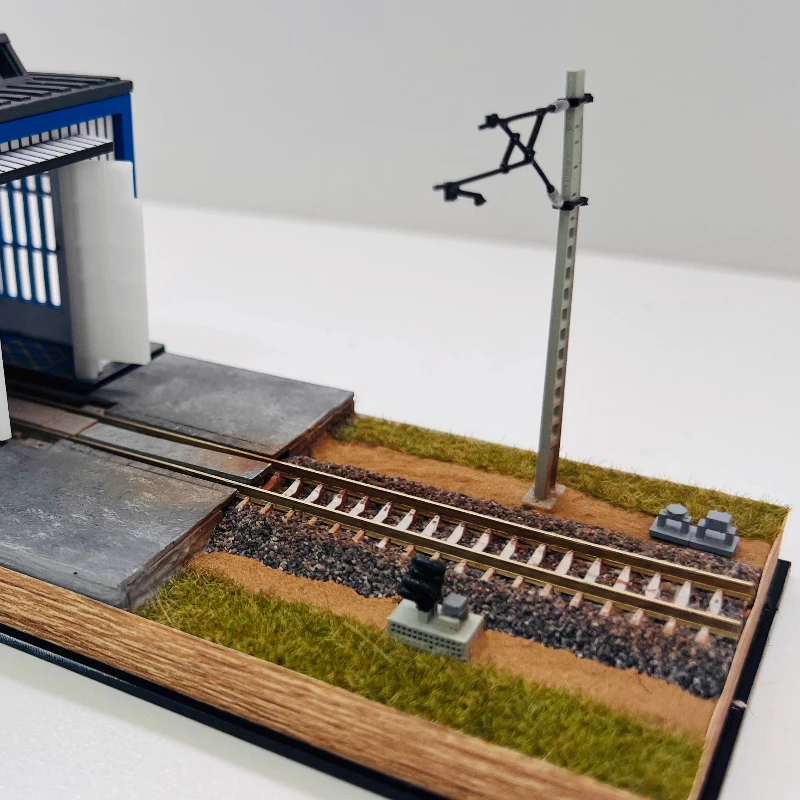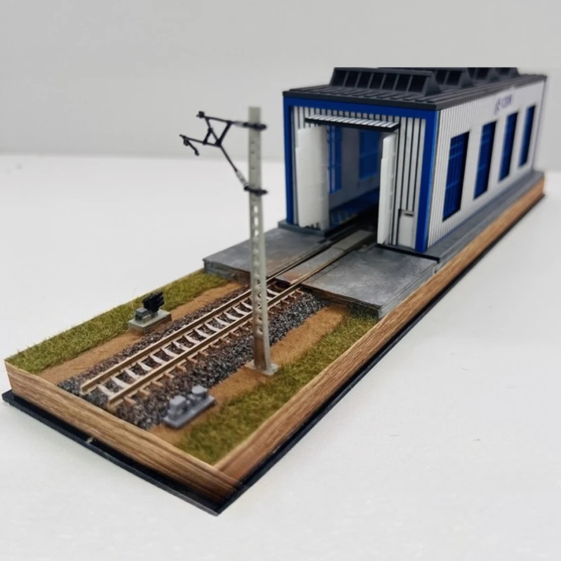 Indulge in the realism of this N-type train model display box, designed to captivate model railroading enthusiasts. The scene features a compact, industrial-style maintenance warehouse crafted with metallic gray and silver panels, showcasing textured metal siding for a true-to-life appearance. The front includes four detailed blue-framed windows with multiple panes, adding intricacy and charm. The rooftop sports three dark, sloped vents or skylights that enhance the industrial aesthetic. In front of the building, a narrow concrete or asphalt platform extends to a short segment of metallic rail track with brown sleepers, creating an authentic railway environment. A slender utility pole with detailed elements completes this realistic scene, perfect for detailed transportation displays.