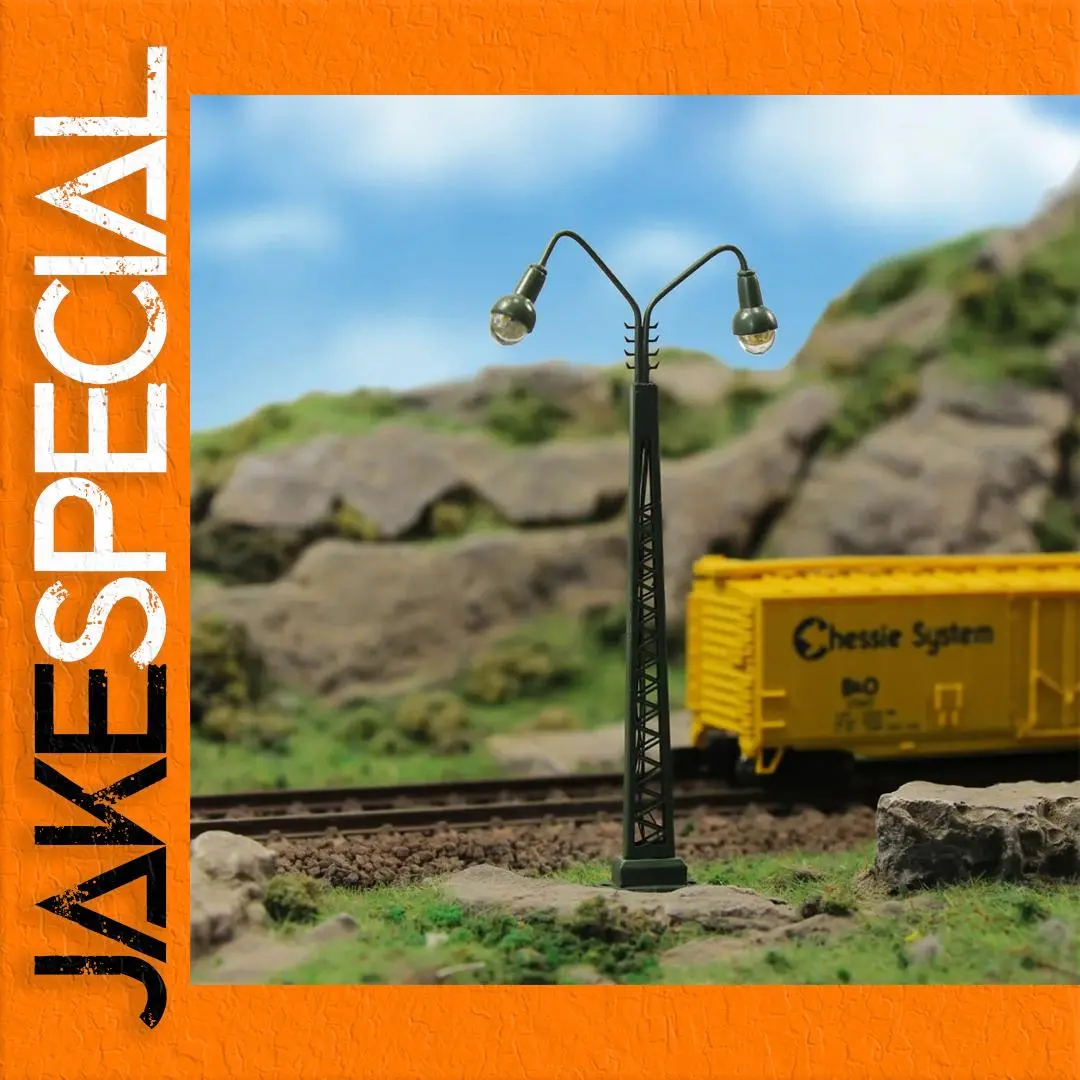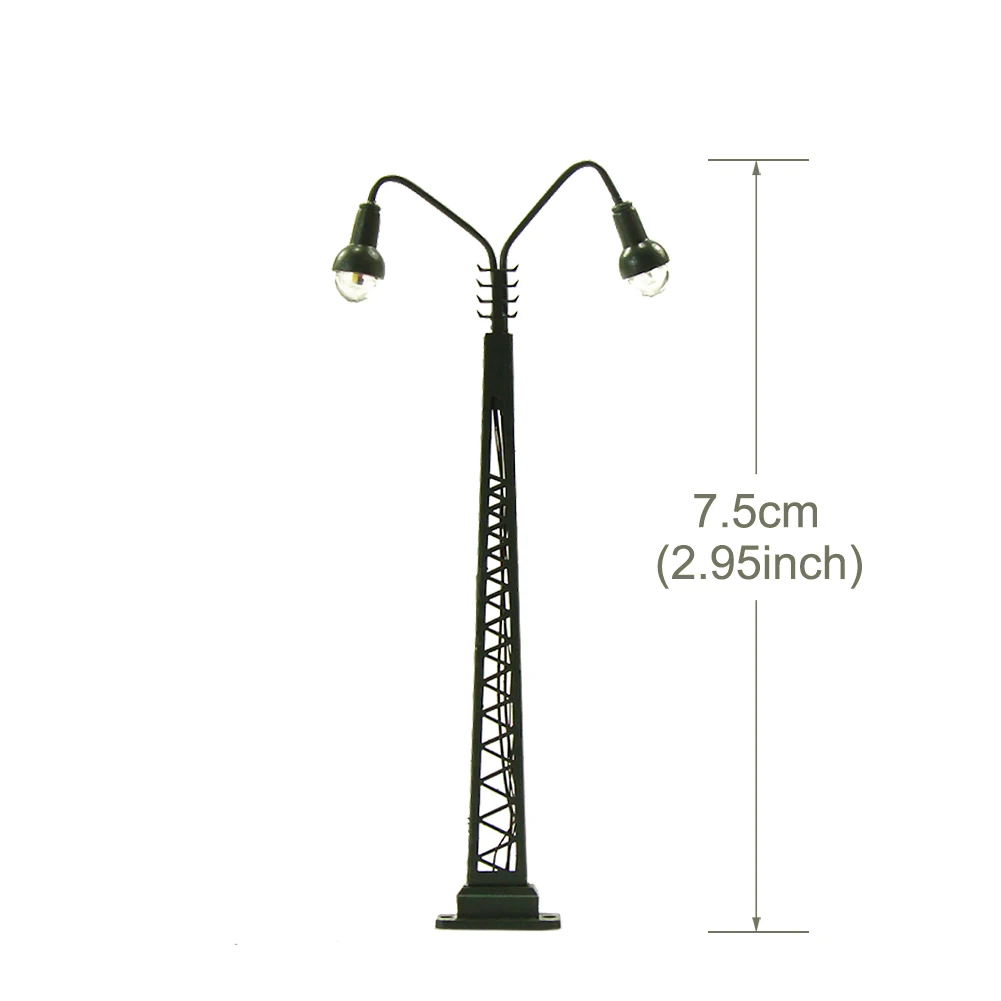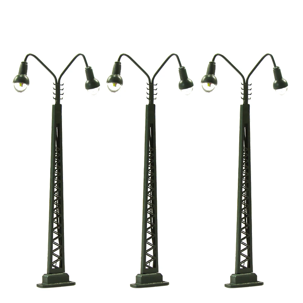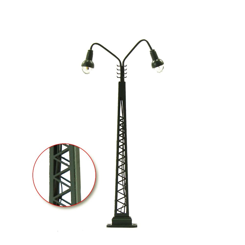 Enhance your N scale (1:160) railway and building layouts with this set of three detailed street lamps, each approximately 7.5 cm tall. Crafted from metal with fine lattice designs, these vintage-inspired lamps feature curved arms supporting metallic-finished, rounded lamp heads housing white LEDs emitting a warm white glow. Designed for 3V power supply, each LED operates at a recommended 20mA. The set includes three complete lamps and three resistors for safe operation between 9V and 18V—resistors must be connected in series at higher voltages to protect the LEDs. These realistic, industrial-style streetlights bring authentic charm to any miniature scene.