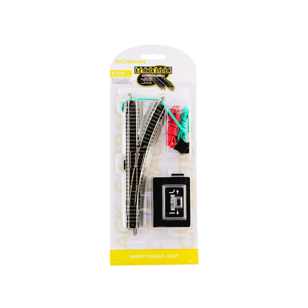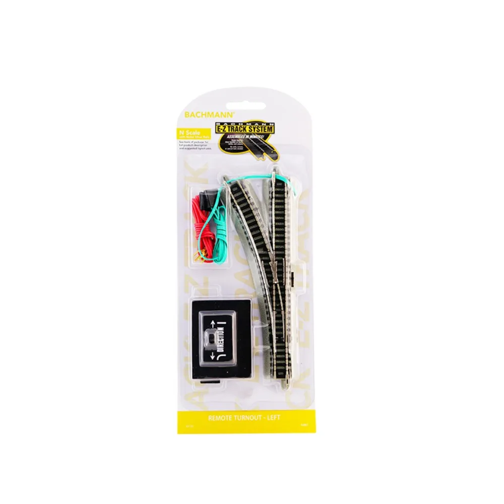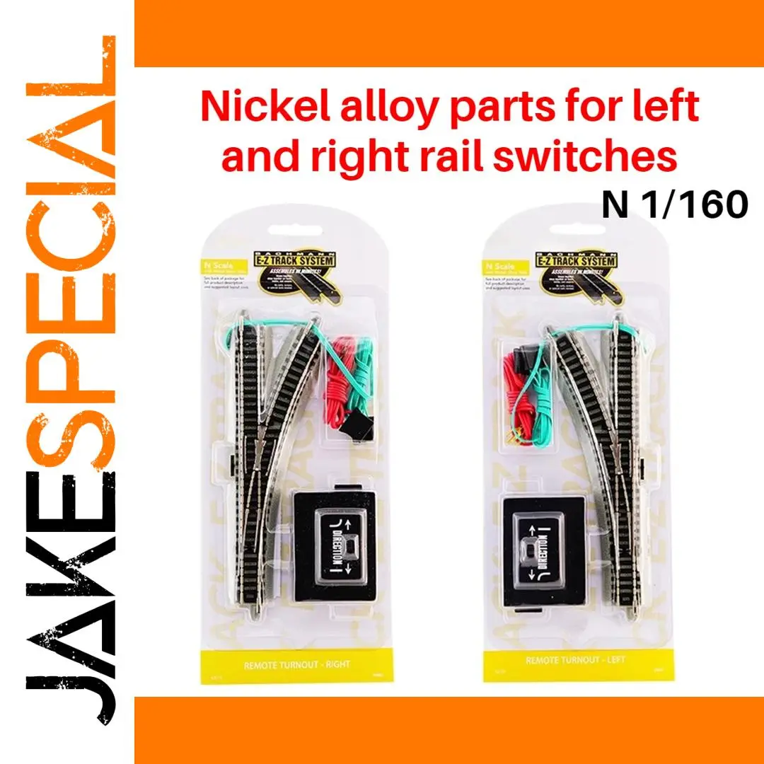 Enhance your model railway with this set of high-quality N-type 1/160 scale accessories by MODEL RTR, designed for left and right switches. Crafted from simulated nickel alloy metal, these detailed tracks feature realistic rail profiles and a sleek matte finish, capturing industrial elegance. The kits include black metal switch tracks mounted on transparent plastic backings accented with yellow highlights, ensuring a striking presentation. Each package also contains a minimalist remote control unit with directional arrows for effortless track switching. Suitable for ages 14 and up, these accessories deliver precise functionality, perfect for dedicated enthusiasts seeking realistic, streamlined railroading experience.