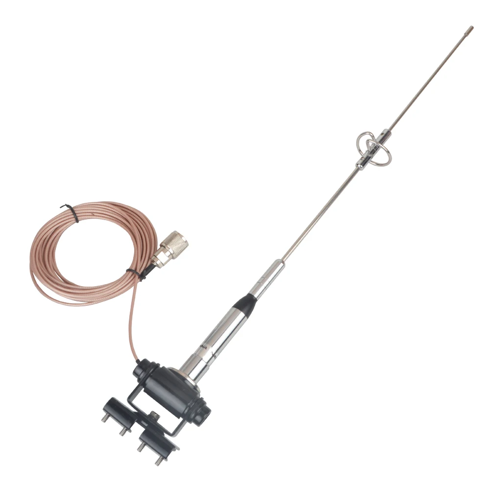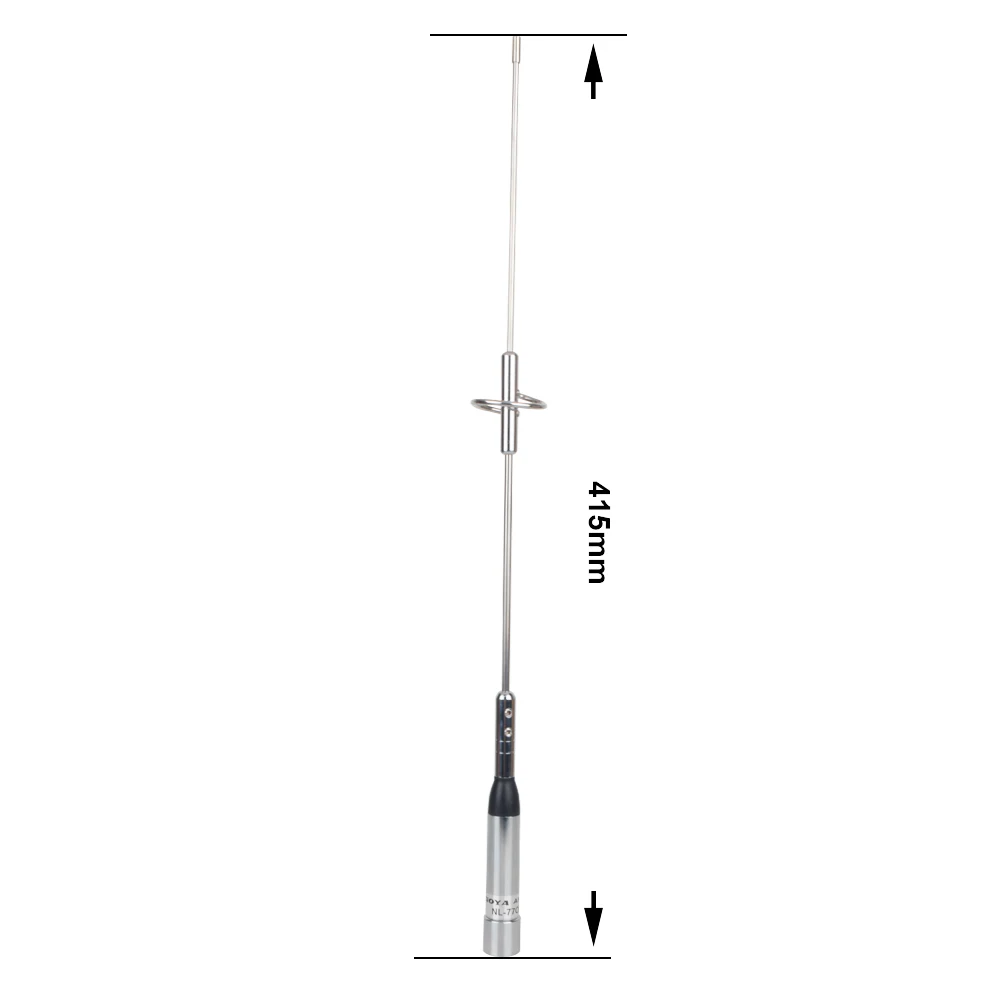 Experience reliable communication with this sleek Nagoya NL-770S dual-band mobile antenna, measuring 415mm in length with a shiny silver finish that reflects modern design. It features a 50-ohm impedance, a gain of 2.15 dBi on VHF (136-174 MHz) and 3.0 dBi on UHF (400-470 MHz), supporting up to 150 Watts of power. The antenna’s efficient VSWR of less than 1.5 ensures optimal performance. It includes a durable PL259 UHF connector, a black K366 mounting bracket for secure installation, and a 5-meter RG-316 coaxial cable with a PL259 plug for flexible setup. Perfect for enhancing mobile radio communication with style and precision.