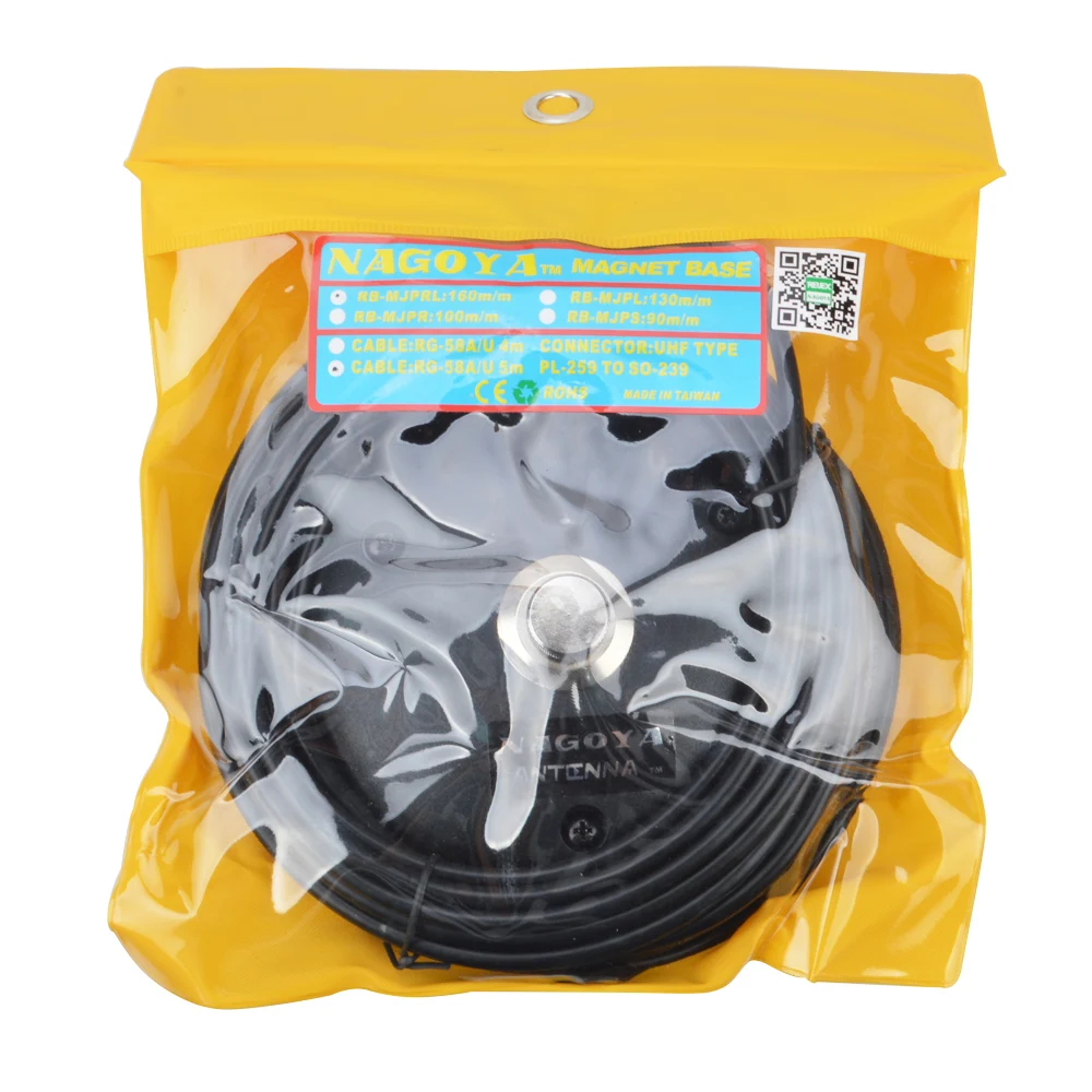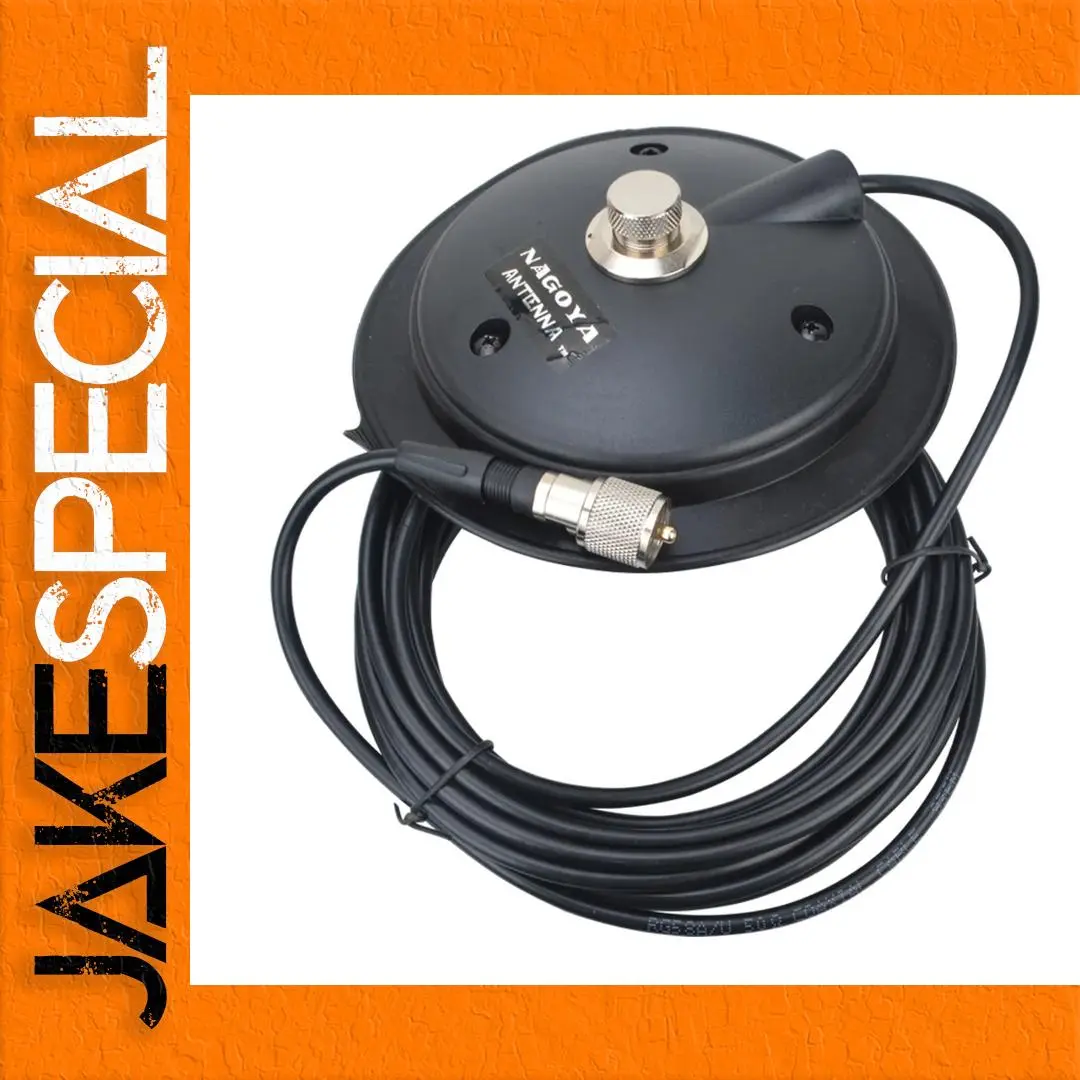 Experience reliable mobile radio communication with the Nagoya RB-MJPRL magnet mount, featuring a durable, black, matte-finish, 160mm diameter circular base and a robust 650g construction. Its strong vacuum magnet base securely adheres to metal or glass surfaces, making it ideal for vehicle or outdoor use. The mount includes a 5-meter RG-58A/U coaxial cable with a shiny PL-259 connector and an SO-239 socket, ensuring seamless connectivity. Designed for stability and durability, this mount is perfect for securing walkie talkie antennas, providing a professional, rugged look for all your mobile radio needs.