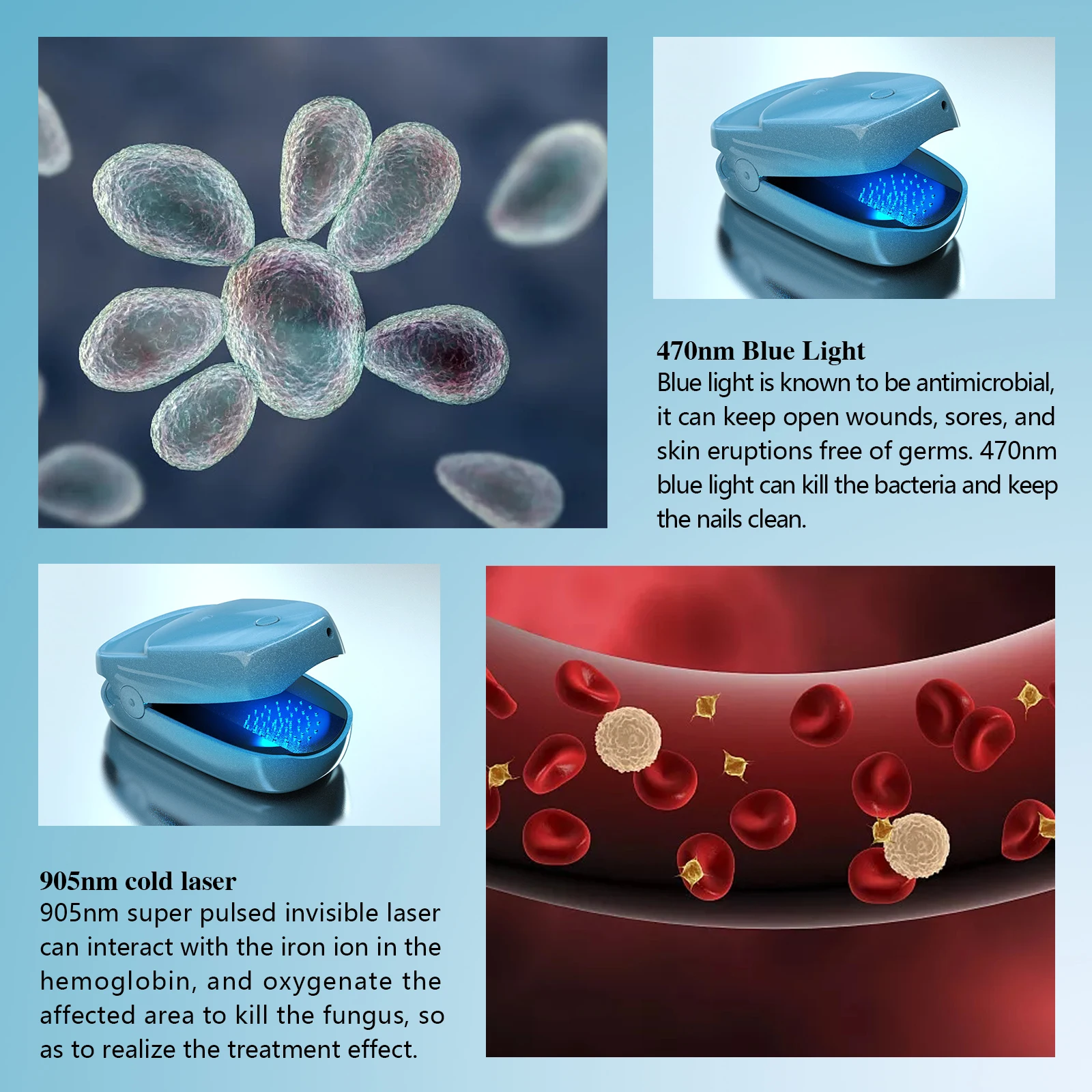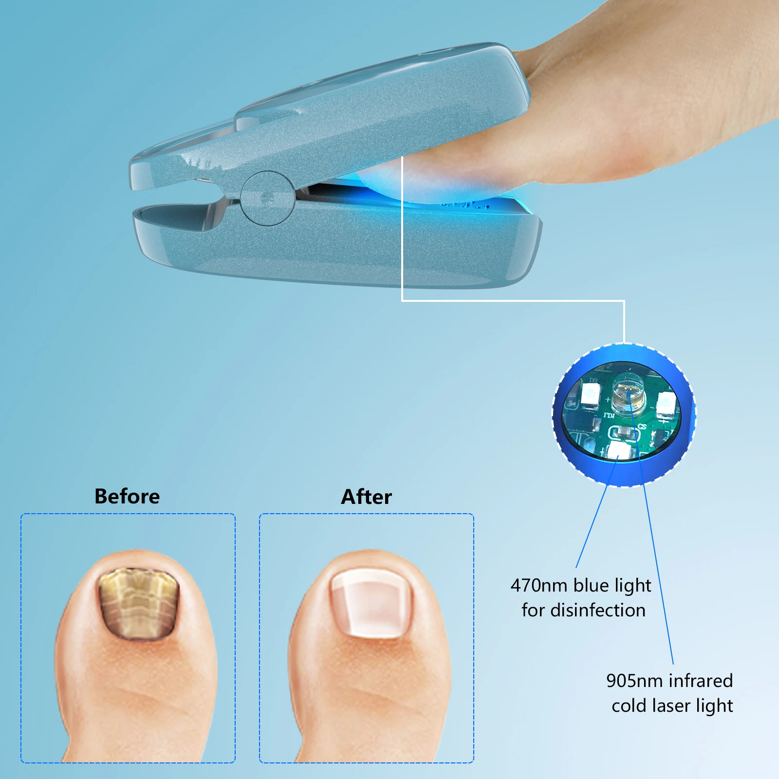 - Operates with a 905nm laser wavelength and 470nm blue light for effective treatment of nail fungus, targeting the infection precisely without harm to surrounding tissue.