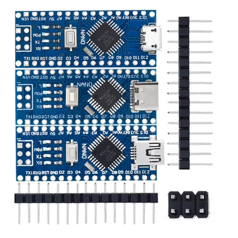 Experience the compact power of this Nano 3.0 Controller, designed for innovative electronic projects. With an sleek blue surface and precise placement of components, it combines modern aesthetics with high functionality. The centerpiece is the ATMEGA328P microcontroller, supported by 12 digital I/O ports, 8 analog inputs, and a serial port for seamless data communication. Its support for PWM on six pins allows for dynamic control of devices like motors and lights. The module features a versatile power input range of 3.3V to 12V DC, suitable for lithium or 9V batteries, making it ideal for portable projects. Compatibility with various development environments such as Flash, Max/MSP, PD, and WWV ensures flexibility. Its design offers multiple connection options, including USB Type-C, Micro USB, or welding, enhancing integration possibilities in diverse applications.