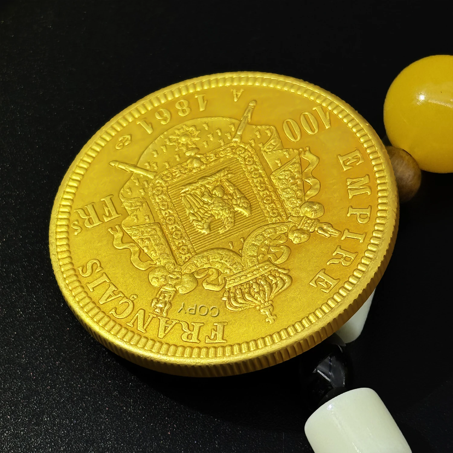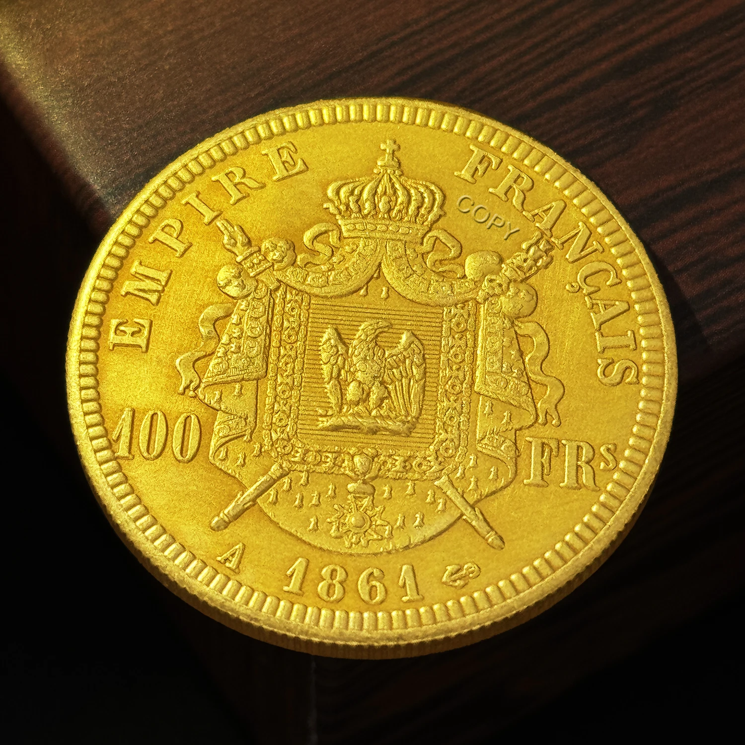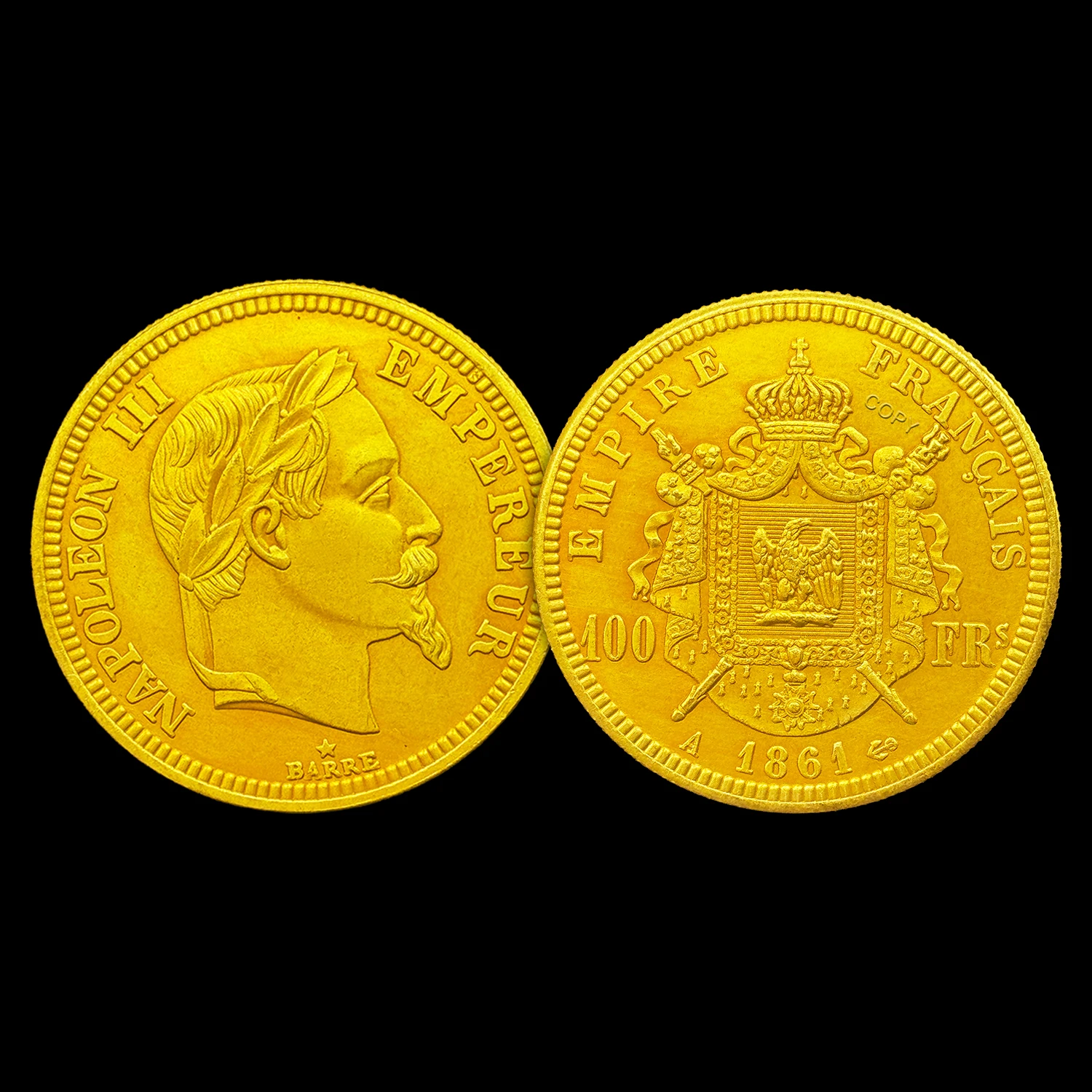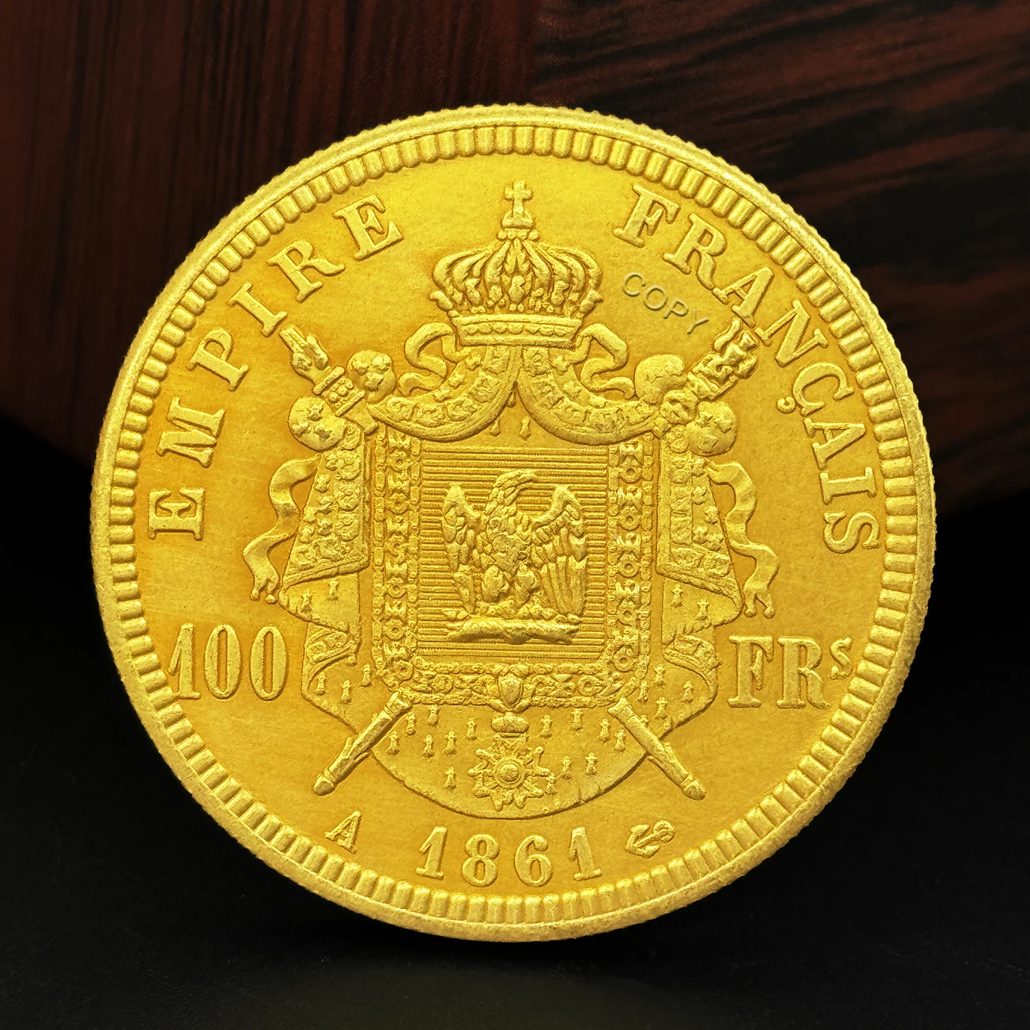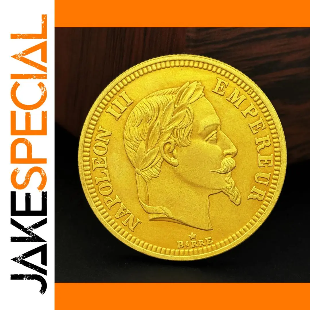 Imagine owning a beautifully crafted medal that embodies 19th-century European artistry. This exquisite piece measures 35mm in diameter and replicates the iconic 1861 Napoleon III 100 Franc gold coin with remarkable detail. The polished vintage copper surface highlights intricate carvings of Napoleon III’s profile, complete with facial features, a laurel wreath, and detailed facial hair. Surrounding the design is an embossed border with small bead-like indentations, adding depth and texture. The inscriptions “NAPOLEON III” and “EMPEREUR” mirror historical engravings, while a tiny star enhances its regal aesthetic. Perfect for display or collection, this medal combines nostalgic beauty with technical craftsmanship, making it an essential piece for history enthusiasts. Its vintage finish and detailed design make it a timeless symbol of European heritage and artistry.