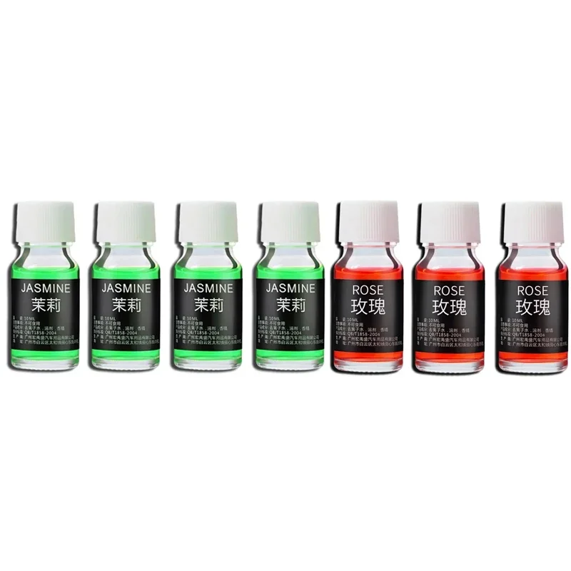 Enhance your driving experience with this set of 7 elegant glass car perfume refill bottles, each measuring 10mm in diameter. Crafted for natural plant aroma diffusion, these non-electric essential oil refills come in vibrant scents such as lemon, cologne, jasmine, osmanthus, lavender, and ocean. They are designed to effectively remove odors and deliver a long-lasting, light fragrance, making your vehicle feel fresh and inviting. The bottles feature white, ridged screw-on caps and minimalistic black labels with white Chinese characters, complemented by decorative green leaves and water bubbles that evoke purity and natural beauty. Scattered green leaves and a blue dropper further emphasize the botanical theme and ease of use.