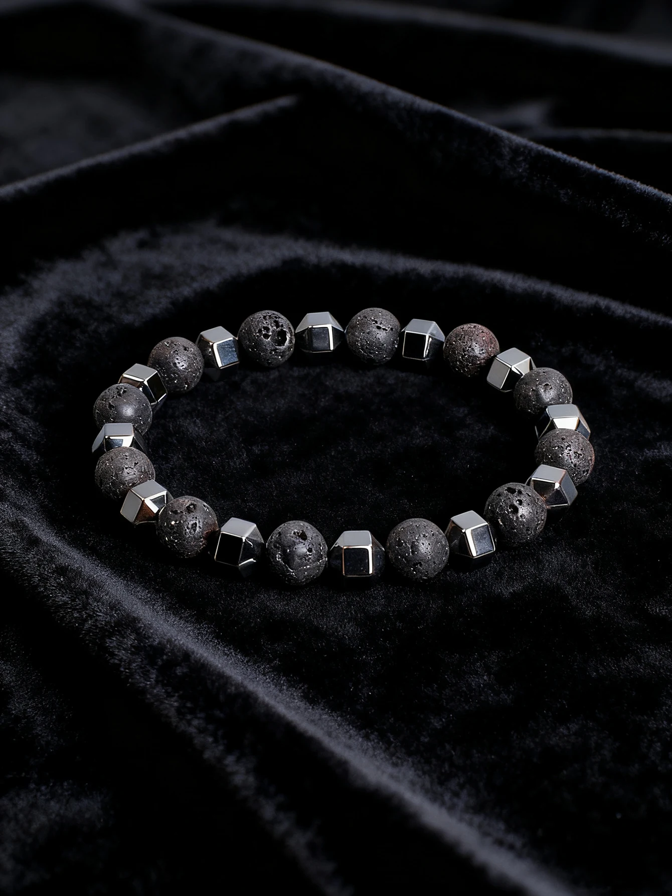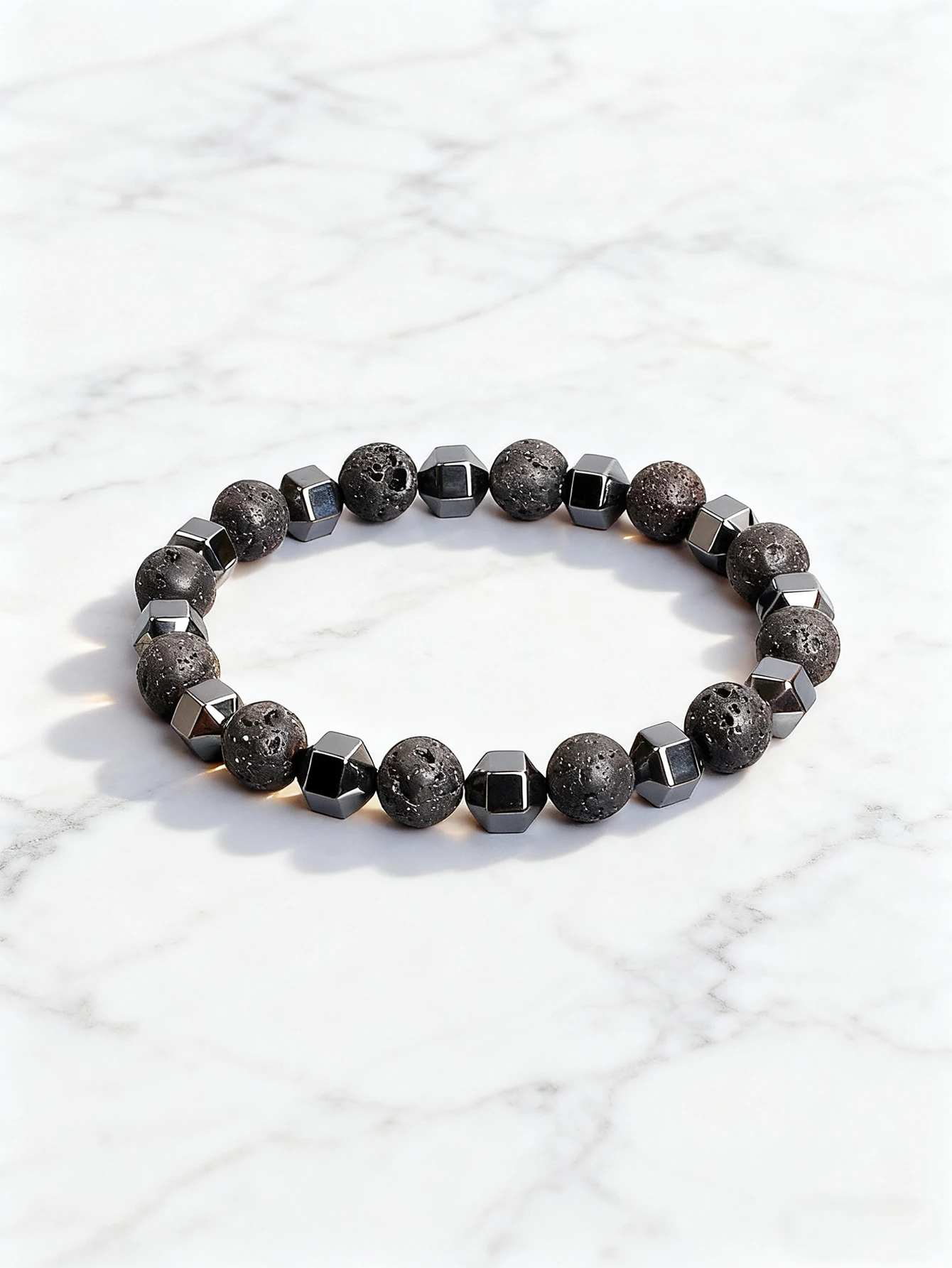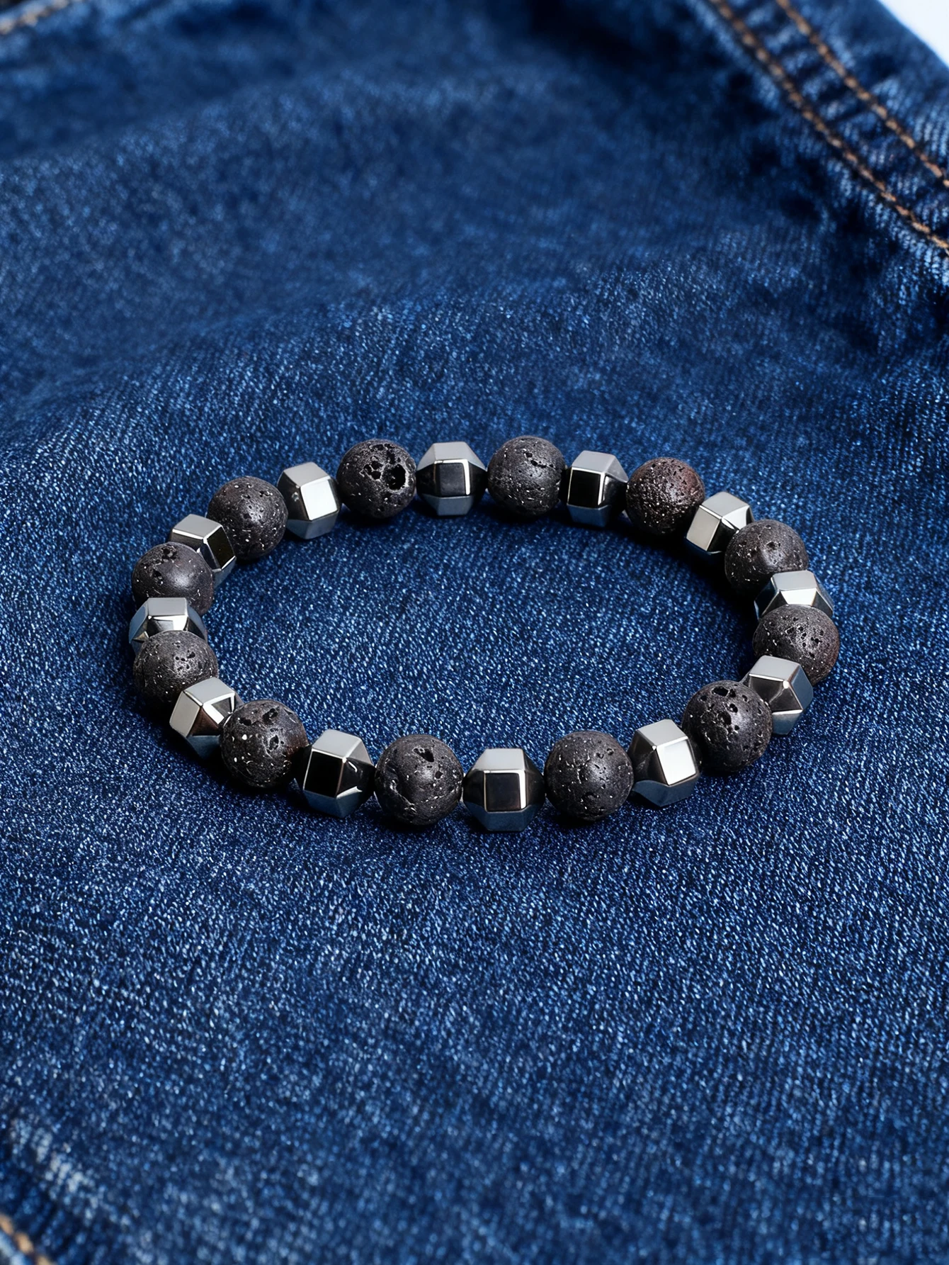 - This unisex bracelet features lava rock volcanic beads and faceted hematite beads, combining rugged textures with reflective metallic shine for a modern aesthetic.