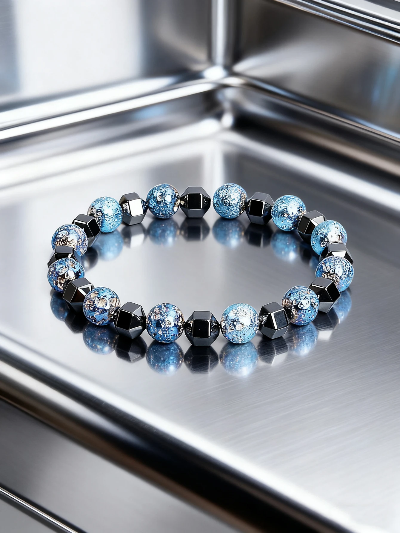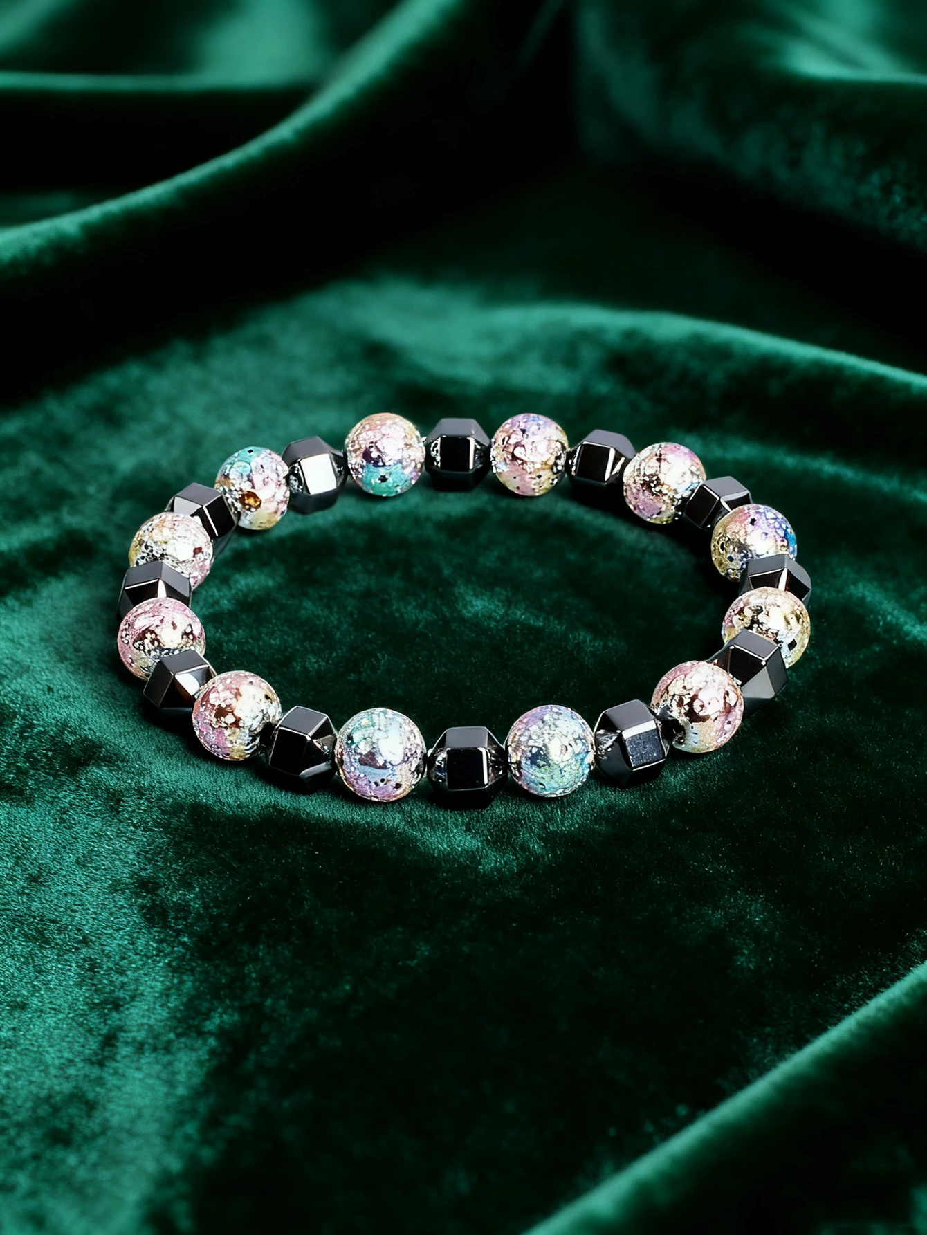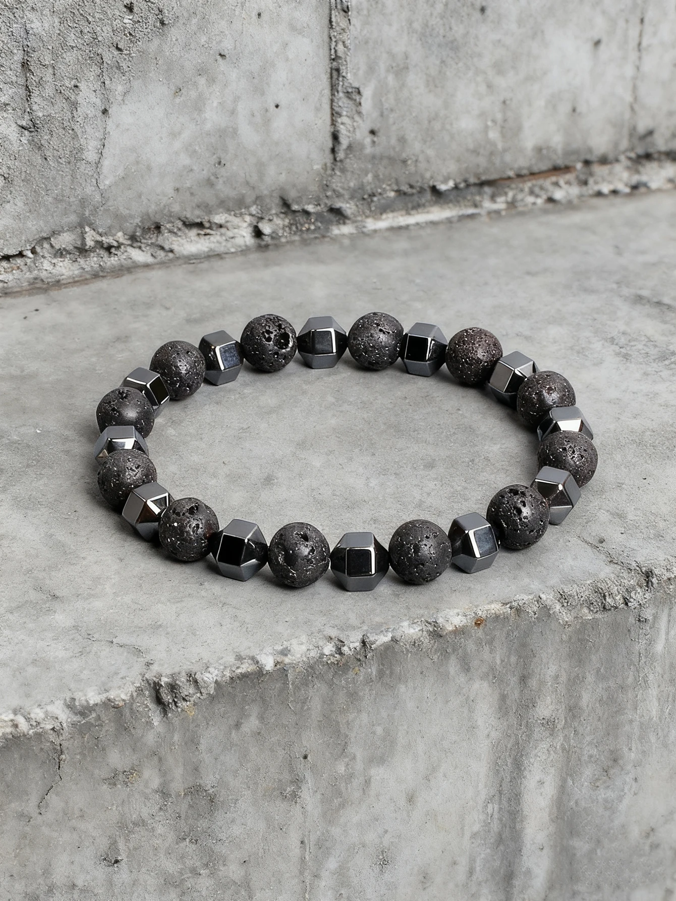 - This unisex bracelet features lava rock volcanic beads and faceted hematite beads, combining rugged textures with reflective metallic shine for a modern aesthetic.