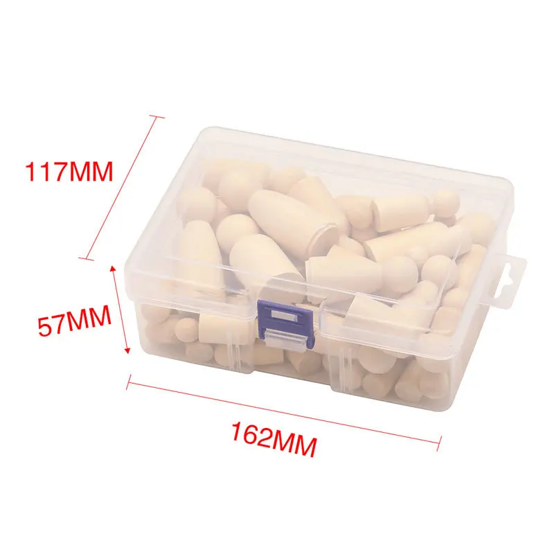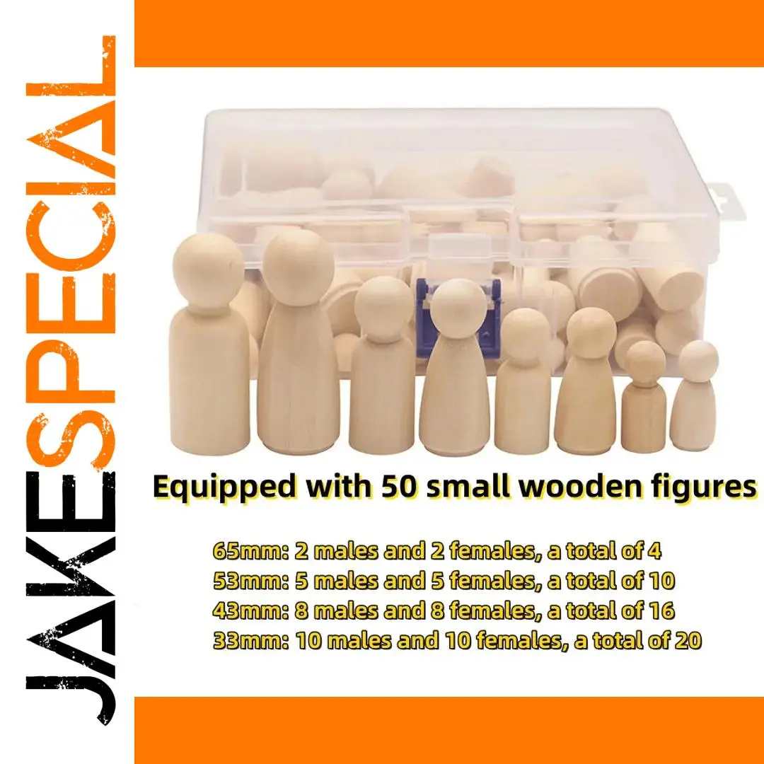- Includes 50 unfinished wooden peg dolls, each with rounded heads and cylindrical bodies, designed for easy customization and decoration.