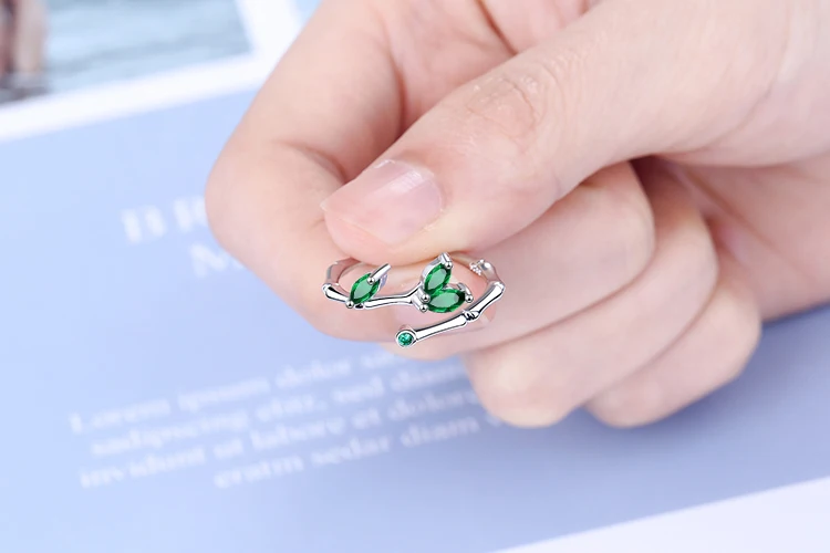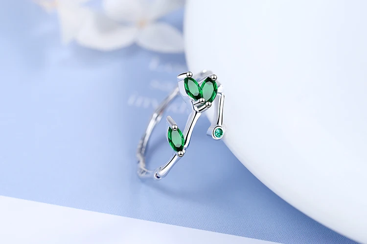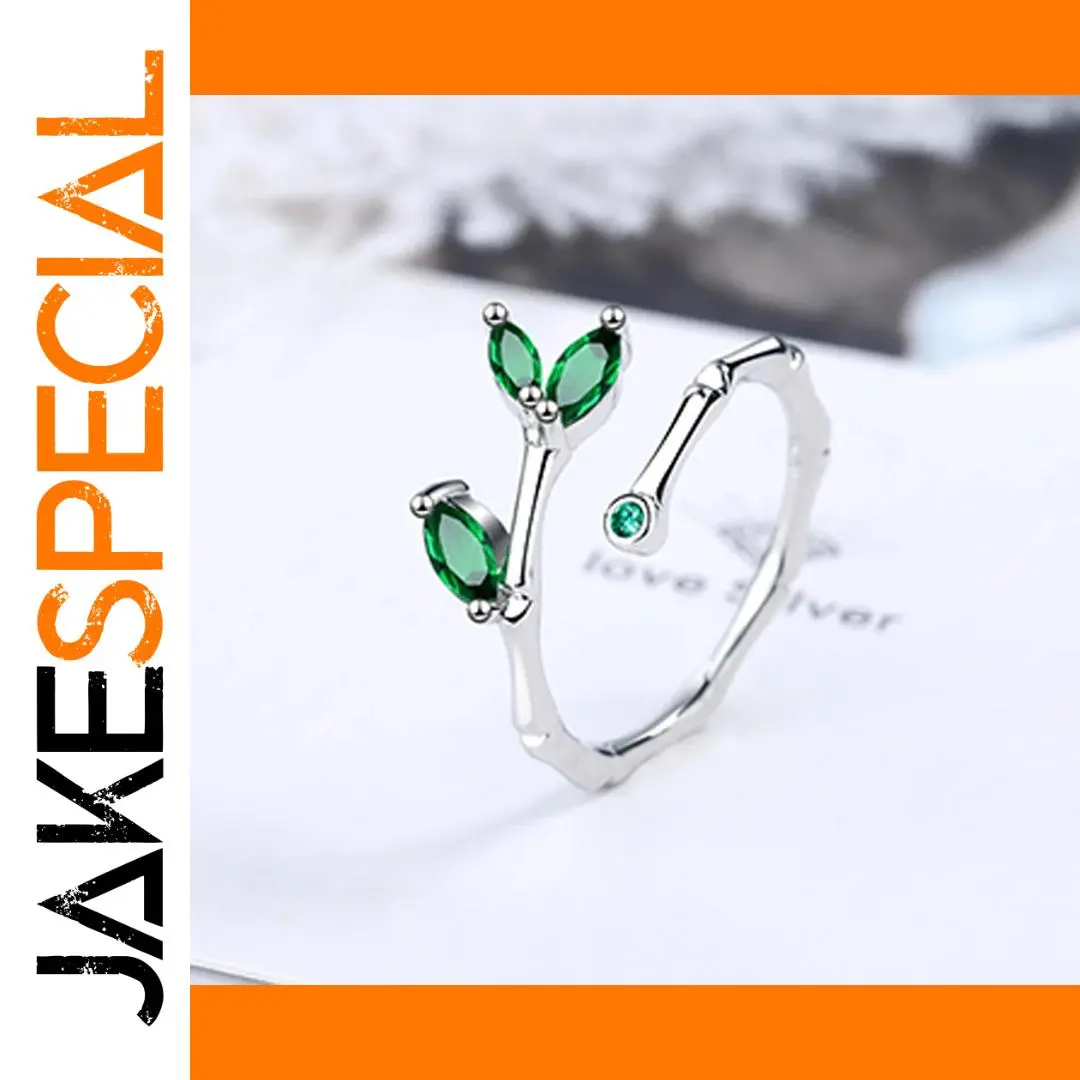 - Features a tension setting with two marquise-shaped, faceted green zircon stones that resemble leaves, catching light beautifully to enhance its organic appeal.