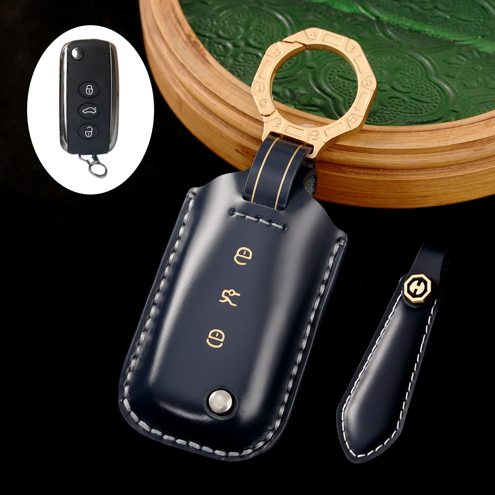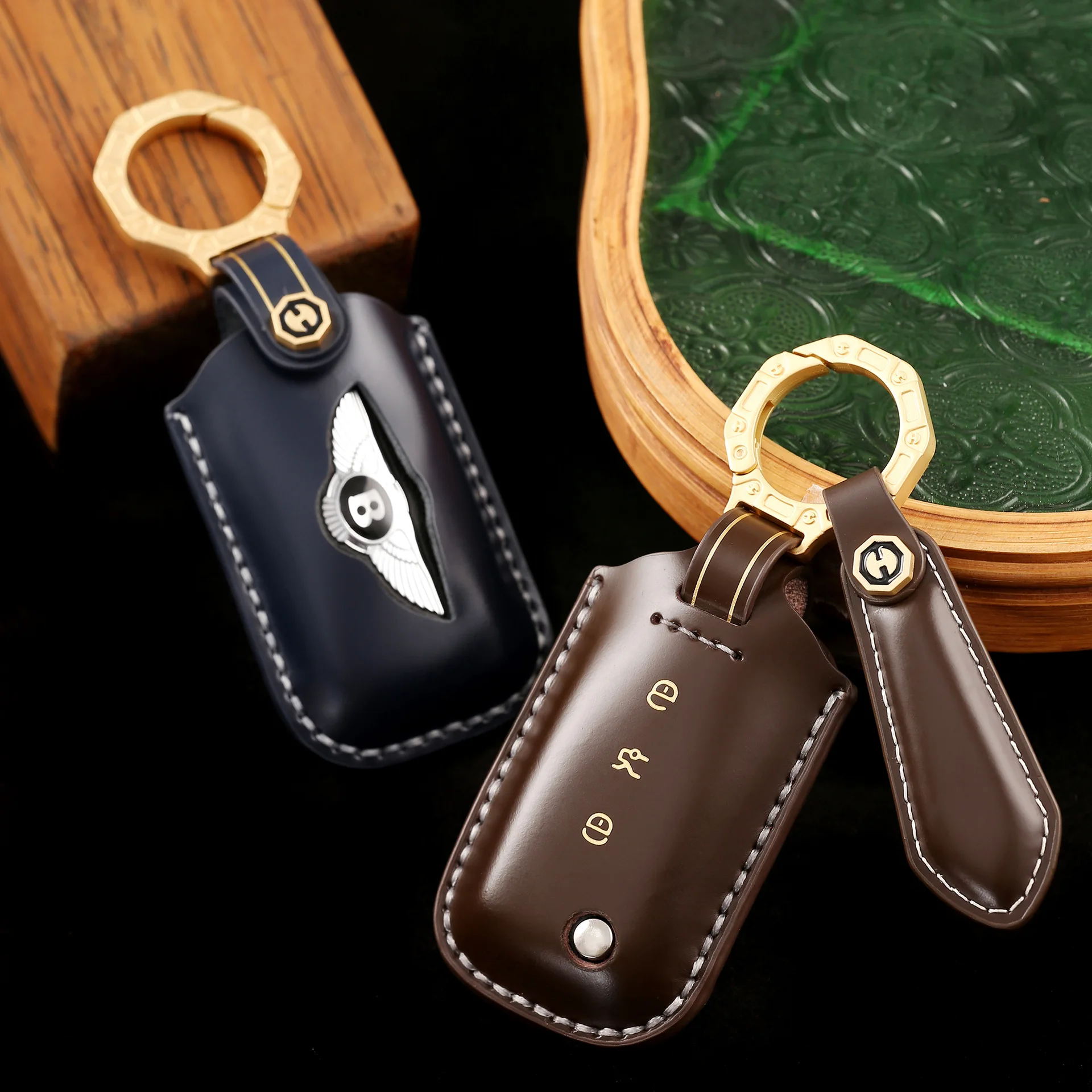 This exquisite leather key case is specifically designed for Bentley owners, ensuring your keys are held in style and sophistication. Crafted from top-layer leather, this key case showcases a beautiful navy blue hue that radiates luxury. Its sleek elongated shape allows for a comfortable fit for your Bentley car keys. The combination of smooth texture, contrasting white stitching, and embossed gold symbols enhance its aesthetic, representing key functions such as lock/unlock and trunk opening. With a decorative golden keyring attachment, a secure snap button, and an elegant leather strap, this key case is the perfect blend of functionality and style.
