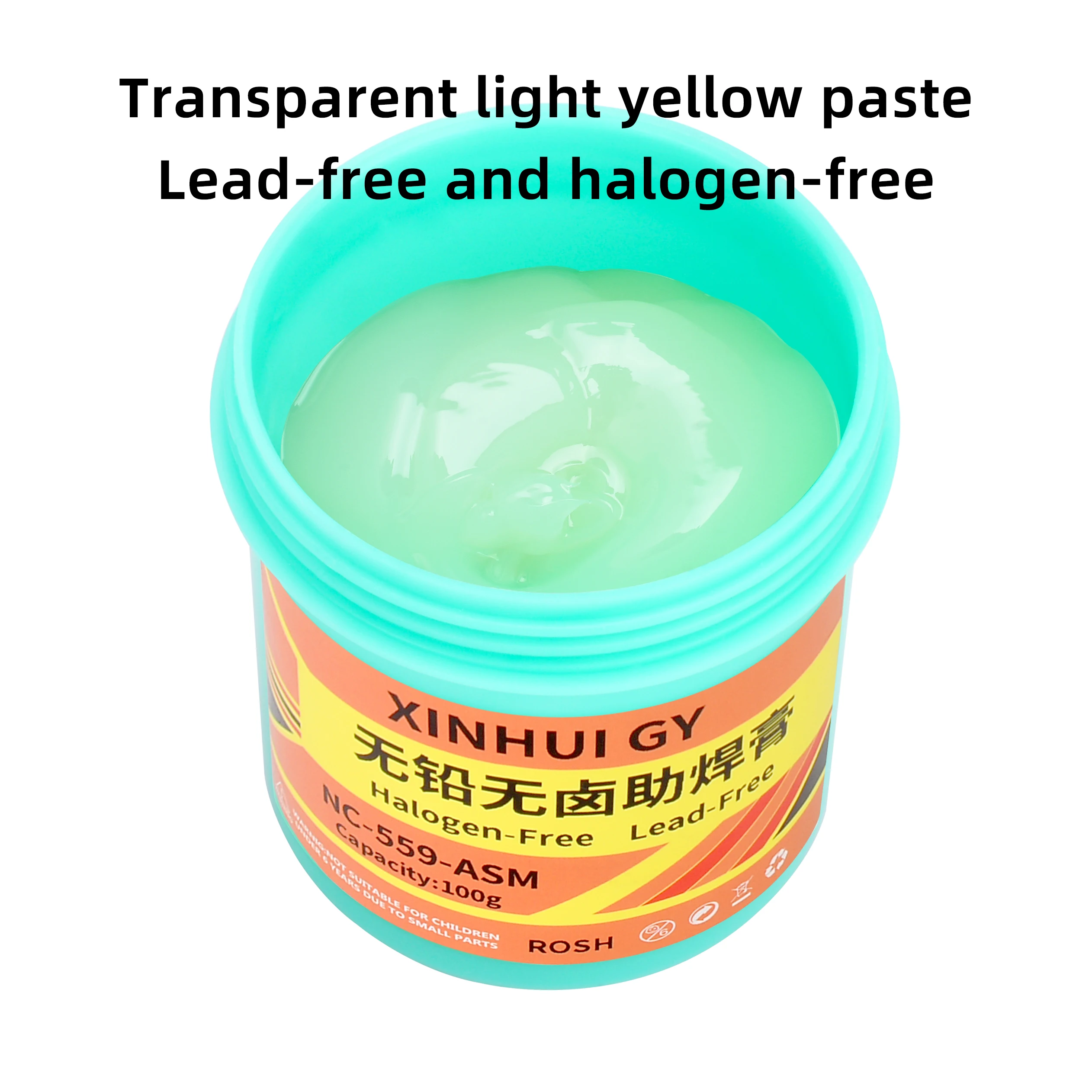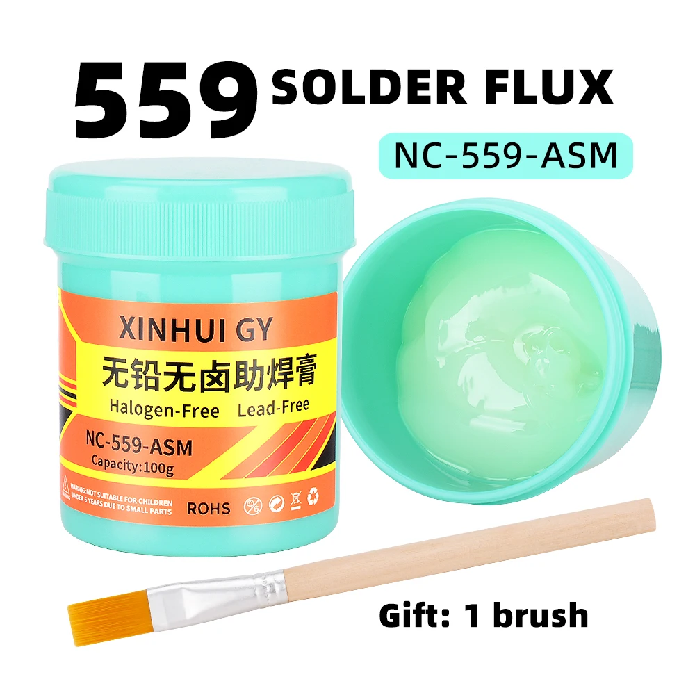 Experience precise soldering with this NC-559-ASM 4-piece flux set, totaling 100 grams, available in two vibrant color variants: XH-559-100g-4JT and XH-559-100g-MS. Designed for BGA rework and general soldering applications, this set includes lead flux and a needle BGA soldering flux, providing excellent flow and adhesion. RoHS compliant, it ensures environmentally friendly use. The set features a sleek cylindrical container with a turquoise lid, complemented by essential tools such as a measurement syringe with an orange bristled brush, an orange flux needle, and various applicators—all organized for efficient workflow. Ideal for electronics enthusiasts seeking dependable, high-quality flux for professional-level soldering.