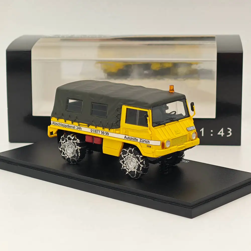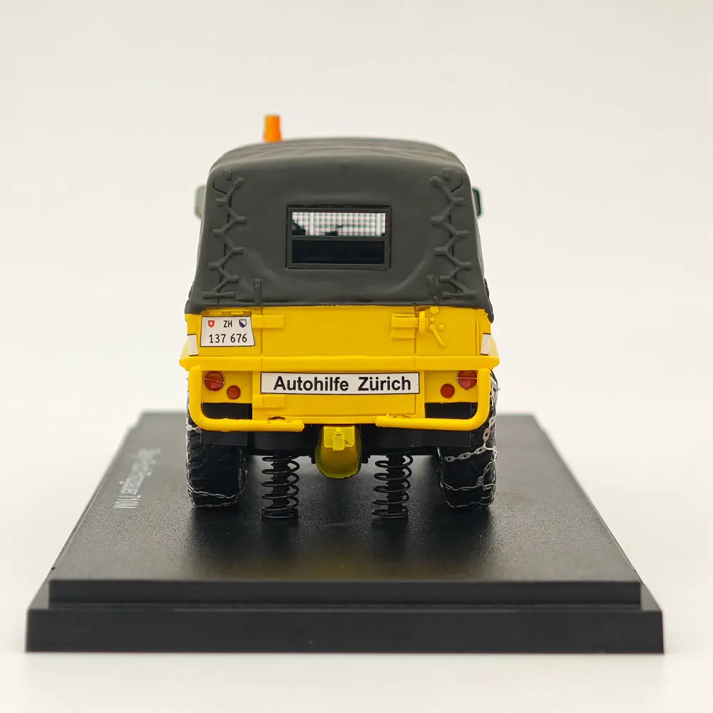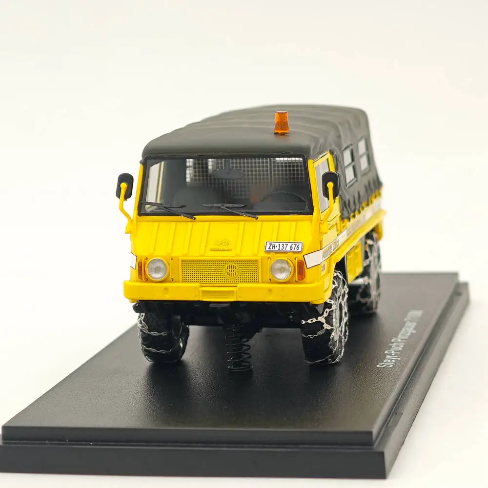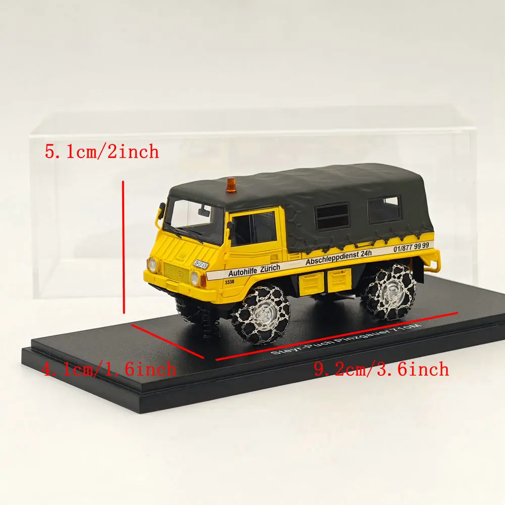 Bring home the detailed 1:43 resin model of the yellow Steyr-Puch Pinzgauer 710M, perfect for collectors and car enthusiasts. This meticulously crafted miniature features realistic details like an authentic yellow body with “Autohilfe Zurich” text, windows, and cable-like wheel structures, all showcased in a clear display case with a sleek black base. Made from durable resin and plastic, it’s ideal for decoration, gifting, or hobby collection. The model measures approximately 3.6 inches long, providing a visually striking addition to any display. Enhance your collection and relive the excitement of classic vehicles with this finely detailed, adult-oriented model.