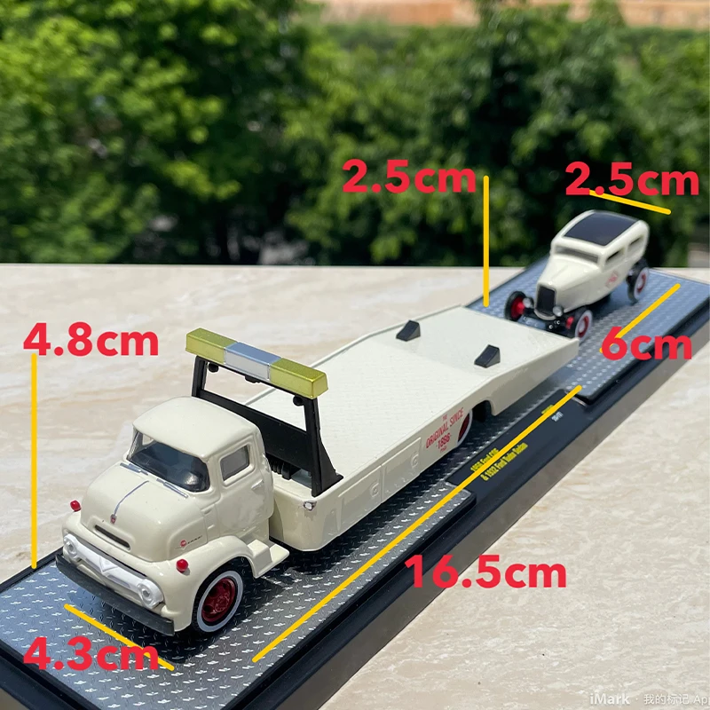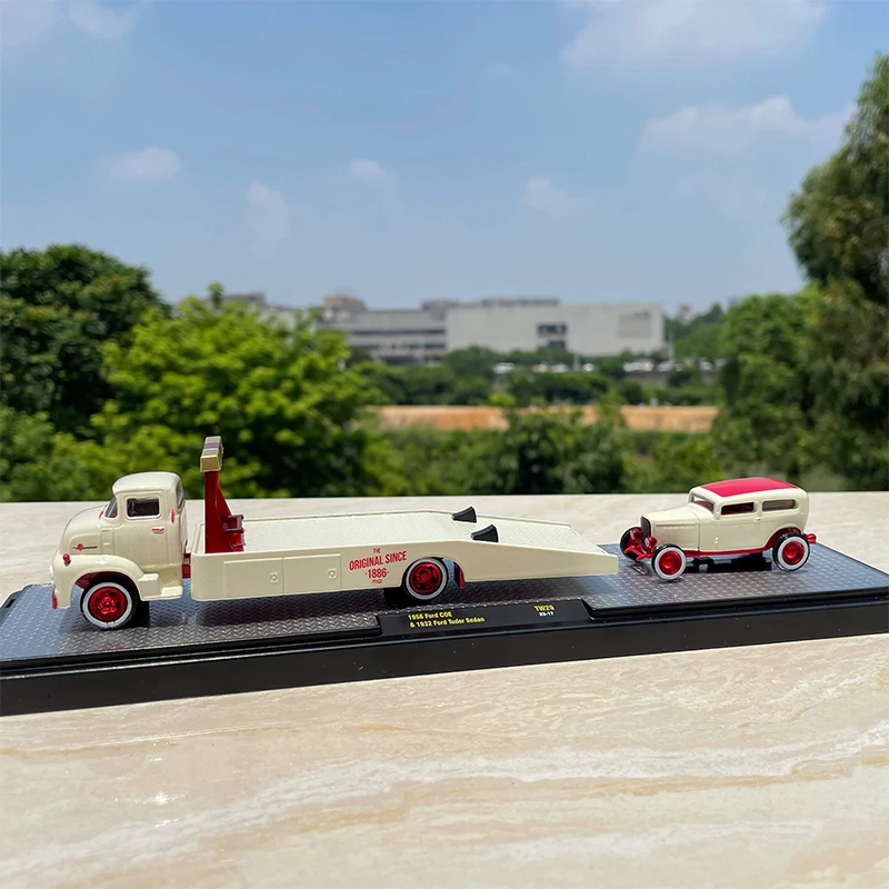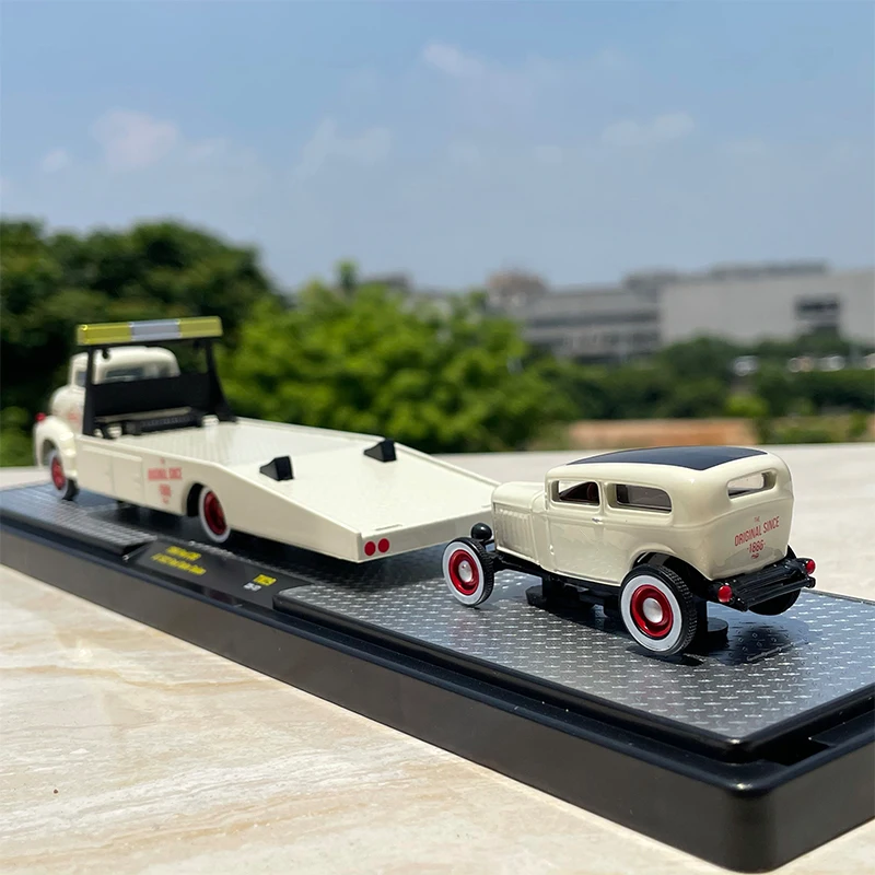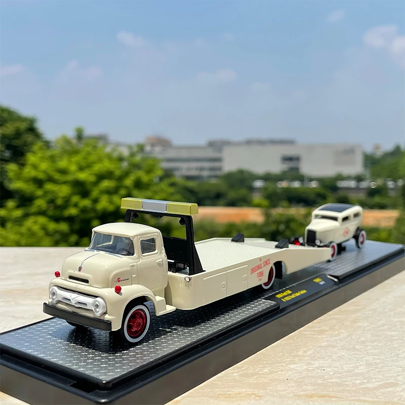 Step into the world of vintage automotive elegance with this beautifully crafted diecast Ford truck trailer. Painted in a sophisticated off-white or cream hue, it perfectly captures the classic design of early 20th-century trucks. The rounded cab corners, curved windshield, and prominent front grille evoke nostalgia, making it a stunning display piece for collectors and enthusiasts. The trailer's sleek, metallic alloy Bed combines durability with style, featuring a low, open profile with a slight lip along the edges. Red-spoked wheels with detailed treads add realism, while subtle decals offer a touch of contrast. Its intricate craftsmanship highlights the fine details, creating a refined miniature that celebrates automotive history. Ideal for decoration and gifting, this model invites you to relive timeless design in your collection.