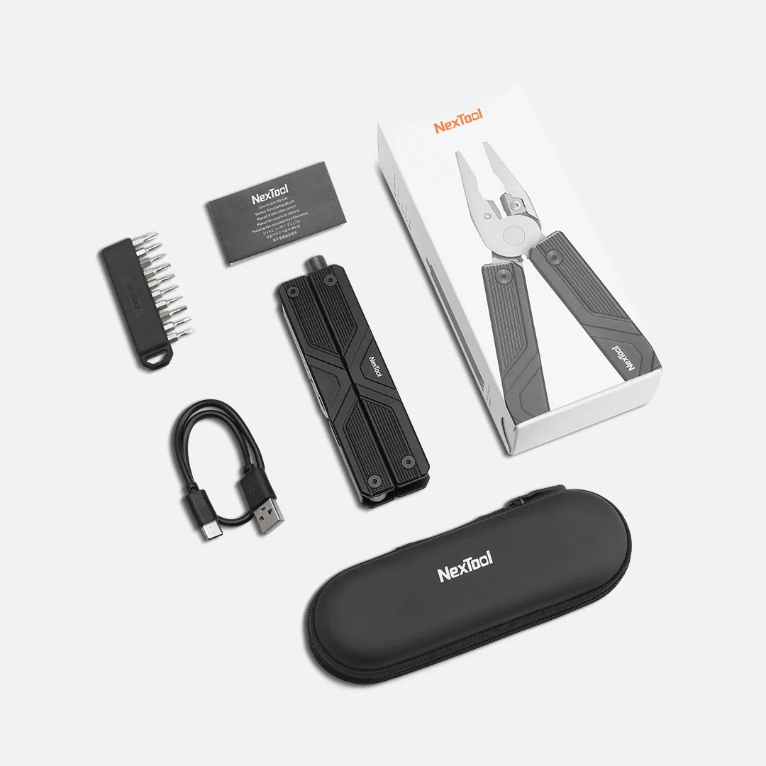 Experience the perfect blend of style and functionality with this black NexTool Gemini 13-in-1 rechargeable electric screwdriver kit. Designed for versatility, it combines screwdriver, pliers, and knife functions into a compact, lightweight unit you can carry anywhere. The modern matte black finish, textured handles, and dynamic diagonal line accents give it a sleek, professional appearance. Its 128.8mm length, 35.1mm width, and 20.1mm height fit comfortably in your hand, while the 278g weight ensures ease of use during prolonged tasks. The device’s polished metal components contrast beautifully with the matte handle, exuding a contemporary yet practical aesthetic. Whether for household repairs or portable projects, this multi-tool empowers your craftsmanship with style and efficiency.