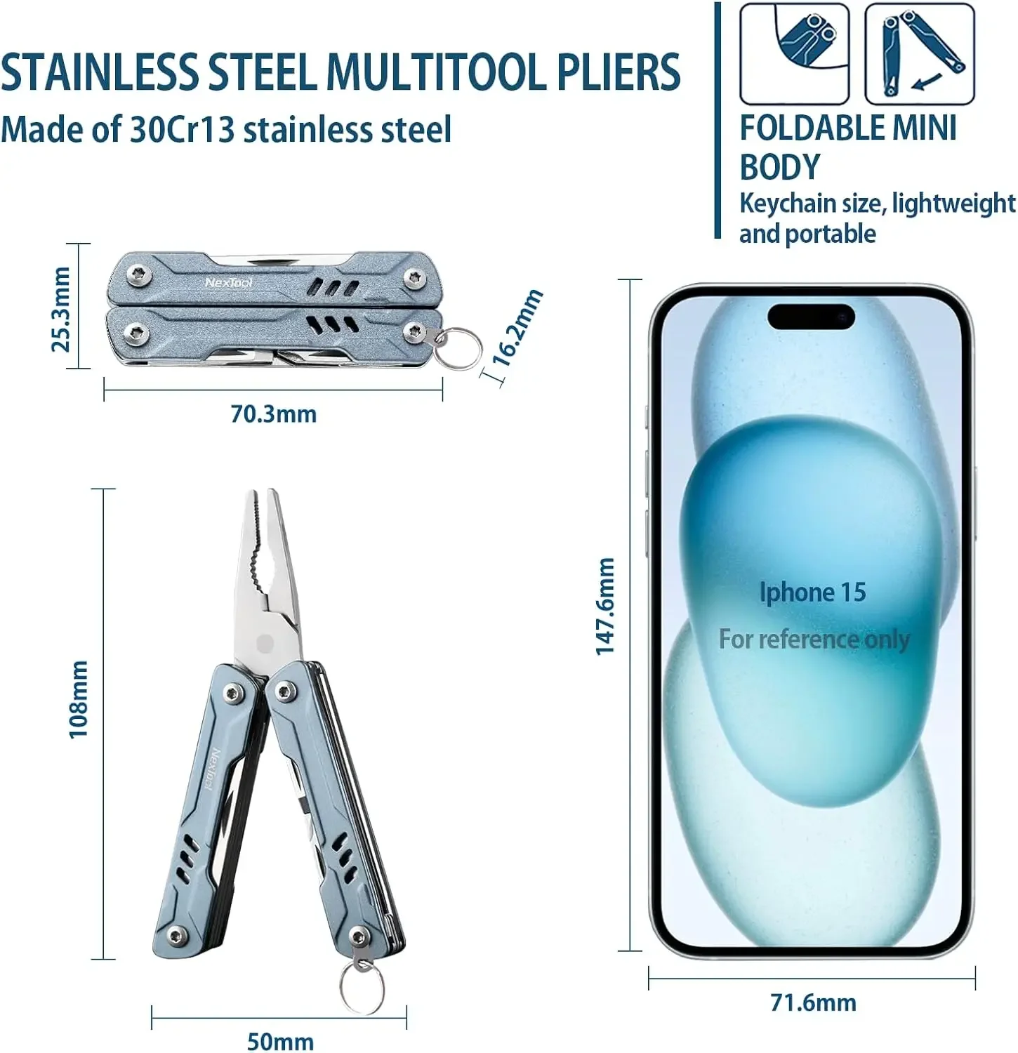 The NexTool Mini Sailor 11-in-1 Multi-Tool is a compact, lightweight device measuring 67.2 x 25.3 x 15.5 mm and weighing just 84 grams, crafted from durable 420J2 metal. It seamlessly combines mini pliers, standard pliers, wire cutters, retrieval card pin, flathead and Phillips screwdrivers, scissors, bottle and can openers, keychain hook, and a multi-tool pocket knife into a sleek, ‘Mini Sailor’ metallic finish. Perfect for household tasks and outdoor adventures, this versatile multitool offers robust functionality in a portable design, making it an essential companion for everyday fixes, DIY projects, or on-the-go solutions.