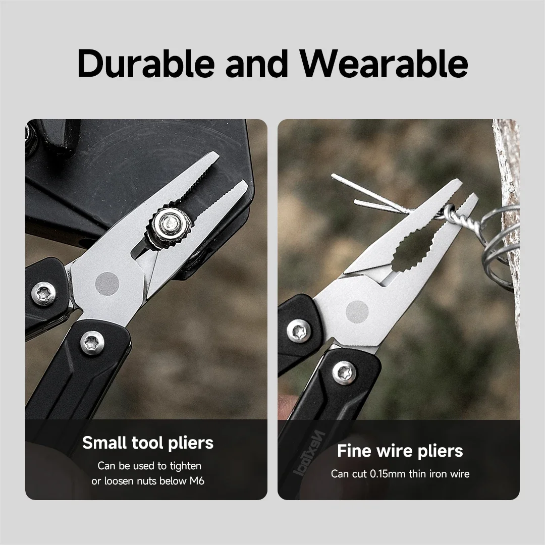 The NexTool Mini Sailor Lite 10-in-1 outdoor multi-tool offers a compact, lightweight design weighing only 84 grams, measuring 67.2 x 25.3 x 15.5 mm. Crafted from durable 420J2 metal, it features foldable pocket pliers with serrated jaws, thin-wire cutters, flathead and Phillips screwdrivers, wrenches, sockets, a bottle opener, can opener, and a metal keychain hook. Its sleek black handles with textured grips combine modern aesthetics with functionality, making this versatile tool ideal for household tasks and outdoor adventures. Experience the convenience of multiple tools in one rugged, minimalist design, perfect for everyday carry.