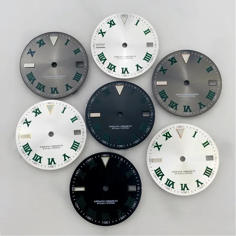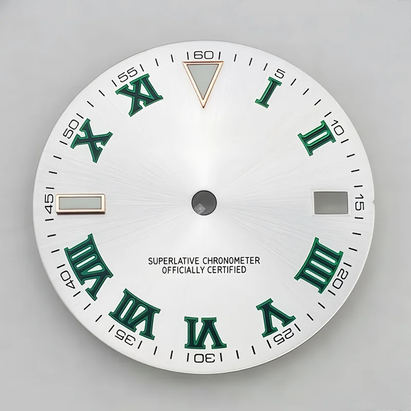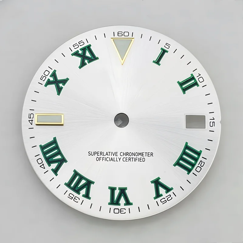 Imagine elevating your timepiece with this refined NH35 dial featuring a sleek 28.5mm diameter. Crafted to perfectly fit NH35 and NH36 movements, this dial exudes sophistication with its metallic finishes and minimalist design. The vibrant green Roman numerals combined with luminous markers ensure high legibility in all lighting conditions. The rectangular date windows at 3 and 9 o'clock add functional elegance, while the inverted triangular marker at 12 o'clock enhances the classic aesthetic. Available in stunning gold, rose gold, and silver tones, this dial transforms your watch into a timeless accessory. Whether upgrading or repairing, this replacement dial guarantees a premium look with reliable compatibility.
