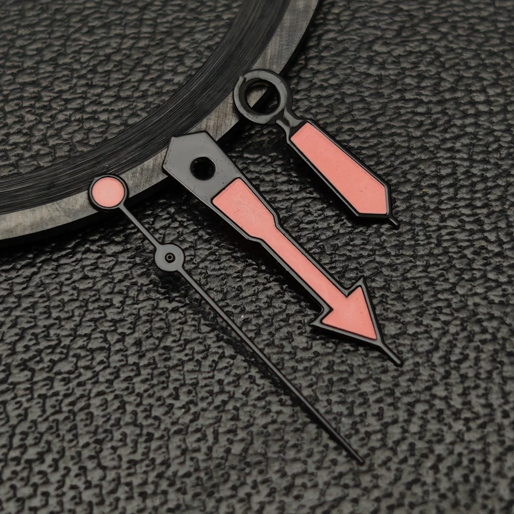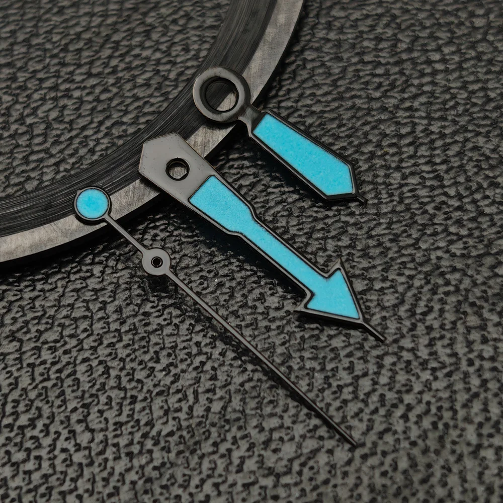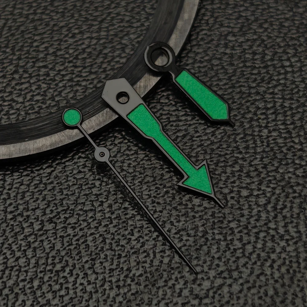 Step into the world of precision watchmaking with this set of luminous watch hands, specially designed for NH35 and NH36 movements. Crafted with a sleek, metallic matte dark gray finish, these hands exude contemporary elegance and durability. The vibrant green super luminous material on each hand ensures excellent readability in low-light conditions, adding both functionality and aesthetic appeal. The set includes a short, broad hour hand with a pointed tip and arrow-shaped luminescent detail, a slim minute hand with a pointed tip, and a needle-thin seconds hand featuring a small circular counterweight. Perfectly balanced for precise fit, these components will enhance any high-quality, professional or hobbyist watch assembly.