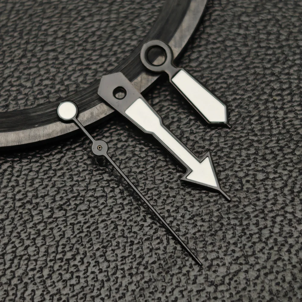 - The comprehensive set includes three different hands: a broad, pointed hour hand with an arrow-shaped lumen, a slender minute hand with a pointed tip, and a needle-like seconds hand with a small circular counterweight.