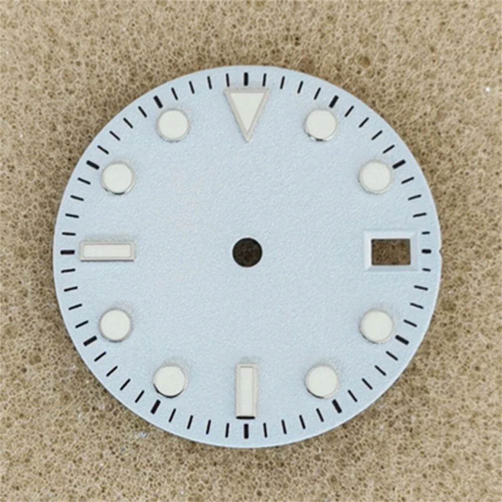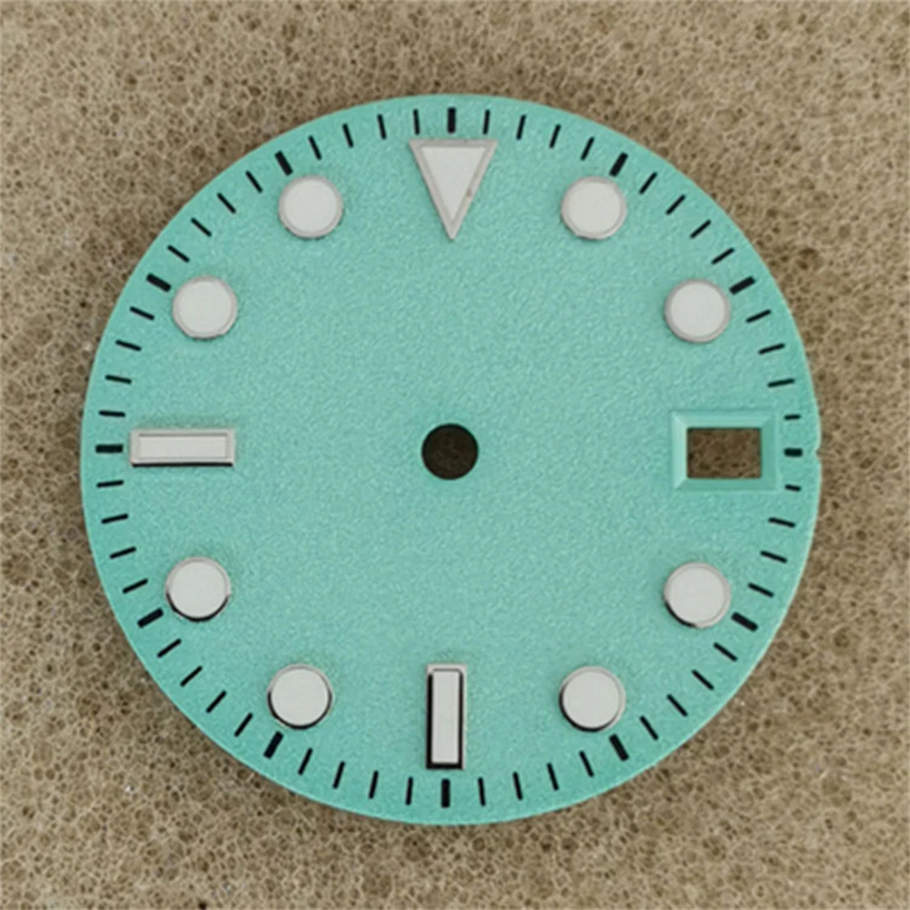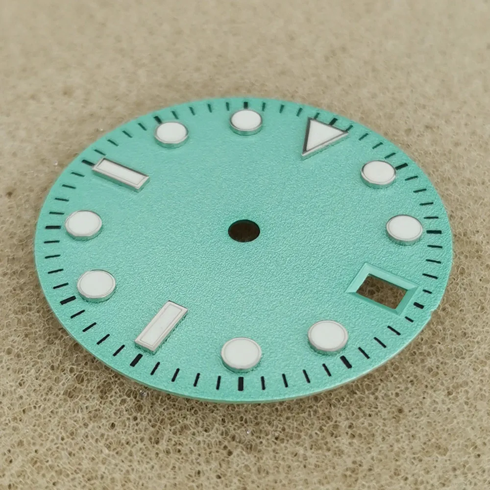 Transform your watch collection with this stylish NH35 frost green dial, perfect for those seeking a sophisticated, minimalist upgrade. Measuring 28.5mm in diameter, it boasts a textured frosted matte finish that adds depth and character. Designed to integrate seamlessly with NH35, NH36, 4R, and 7S automatic movements, this dial is specifically crafted for precise installation at the 3 o'clock handle position. Its clean, no-logo design showcases white luminous markers: round hour markers, a triangle at 12 o'clock, rectangles at 6 and 9, and a square date window at 3 o'clock, all enhancing readability in low-light conditions. The printed dot-scale font offers a modern, sleek aesthetic, making it ideal for customizing your timepiece with subtle elegance.