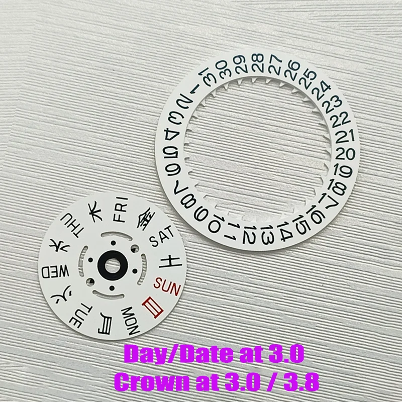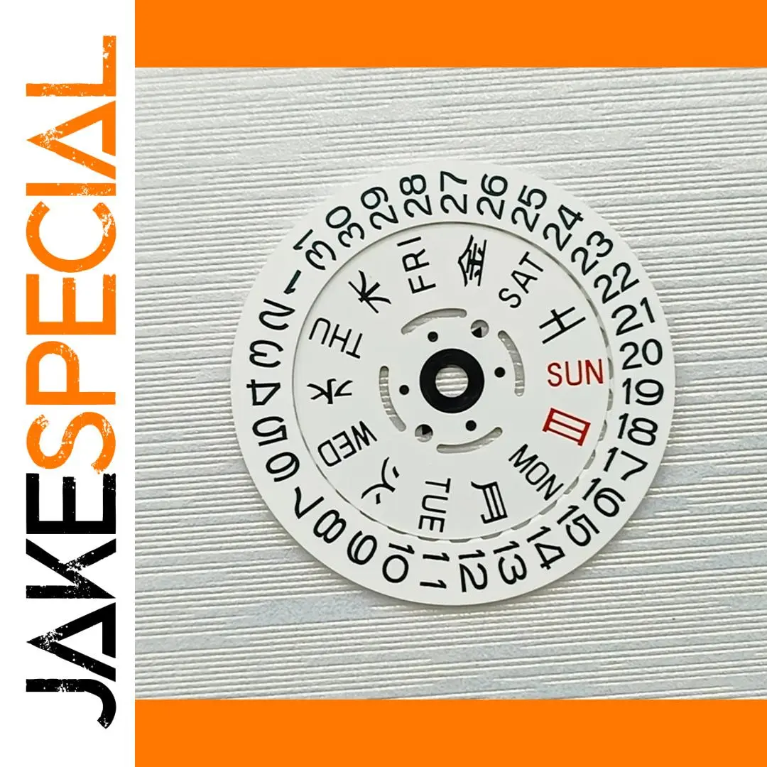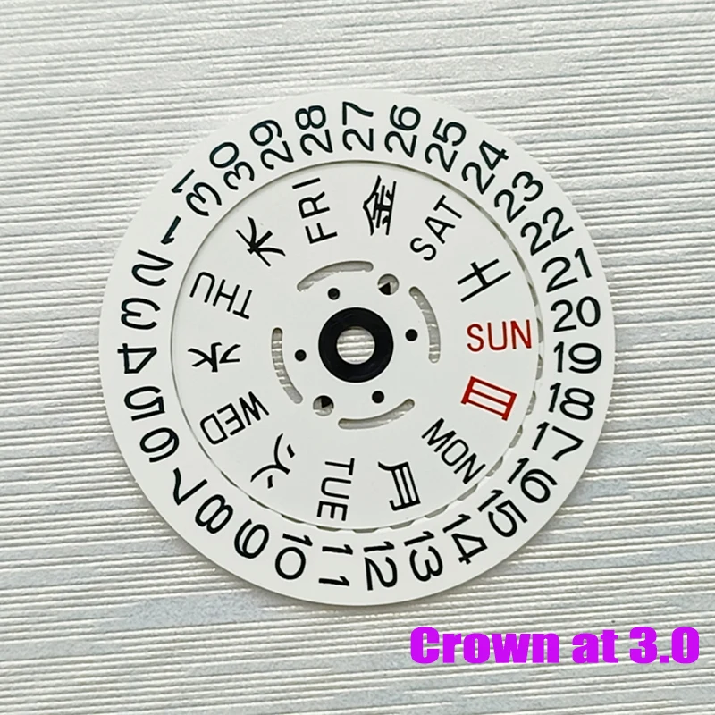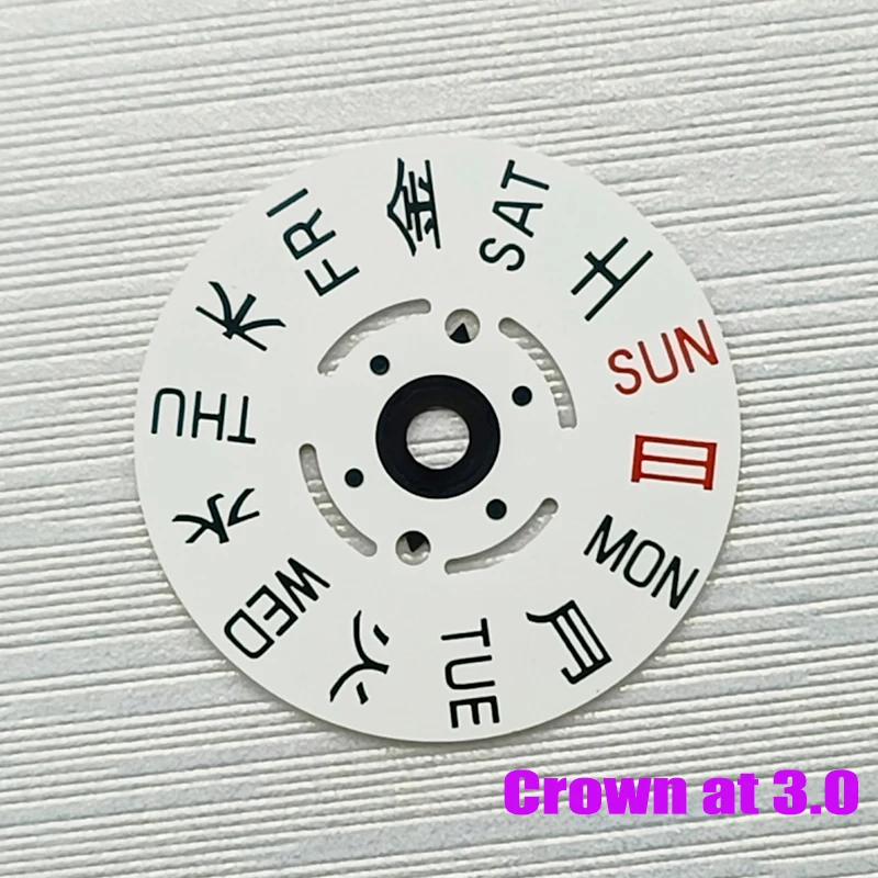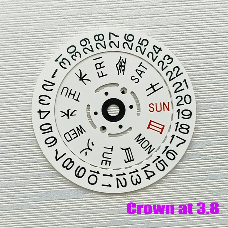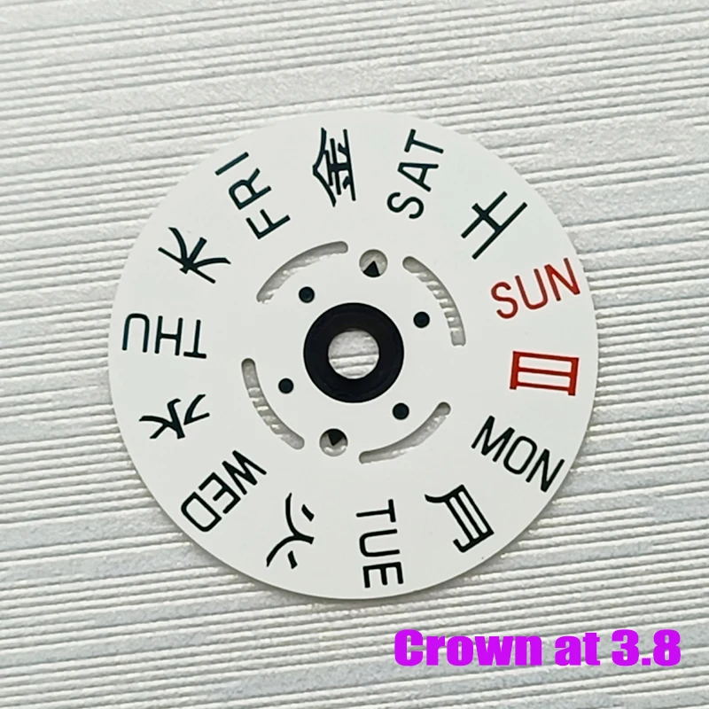 - Includes a Japan Kanji week wheel with Sundays and Saturdays highlighted in red for quick recognition; designed for crown positions at 3.0H or 3.8H.
