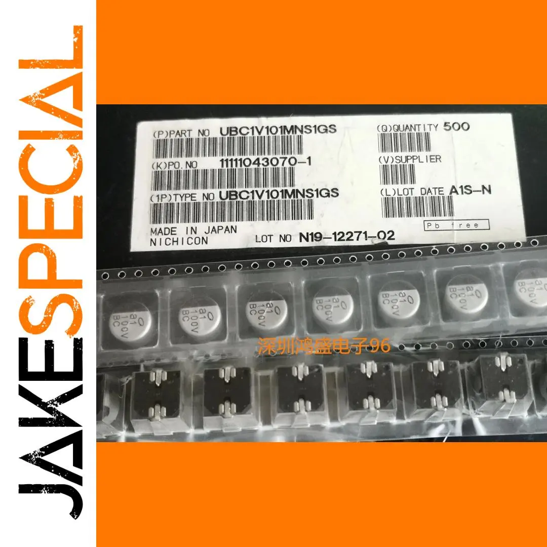 - Technical specifications include: model designation UBC1V101MNS1GS, 100µF capacitance, 35V voltage rating, size 10x10mm, and surface-mount form, ensuring versatile application compatibility.
