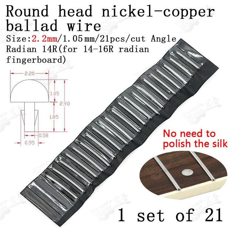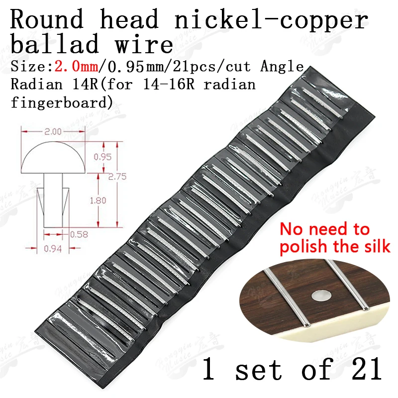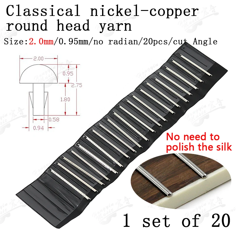 Experience precision craftsmanship with this nickel-copper alloy round-head fret wire, designed for classical, folk, and electric guitars. Available in 20F, 24F, and 20F configurations, it features a sleek, highly reflective silver finish and circular ends for effortless installation without grinding. The fret wire offers diverse dimensions and radii, including options like R Classic 2.0 0.95h, R Folk 2.2 1.05h, and REG Sta 2.9 1.5h 12R, ensuring compatibility with models such as HG130, HG160, R380, and R straight. Crafted from durable brass or cupronickel, it embodies both style and functional excellence for professional guitar setups.
