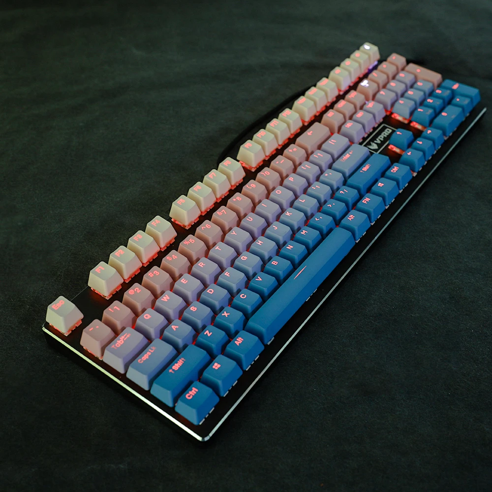 Imagine elevating your mechanical keyboard experience with this visually captivating Night Sunset keycap set. Designed for enthusiasts who appreciate both functionality and aesthetics, these 122 premium PBT double shot OEM profile keycaps transform your setup into a vibrant, luminous display. The gradient color scheme transitions seamlessly from a warm pinkish sunset hue to a serene blue, perfectly complemented by semi-transparent, pinkish-red Legends that shine brightly during backlit use. Crafted with durable, dye-sublimated double shot PBT, these keycaps are built to last, offering a premium feel with their 1.25mm thickness and matte textured surface. Whether for gaming or typing, they bring a personalized, luminous touch to your keyboard, making every keystroke inspiring.